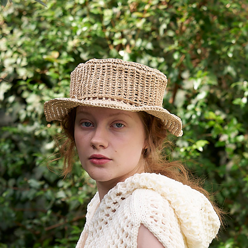 リゾート気分を盛り上げてくれる麦わら風のカンカン帽はサイド部分の引き揚げ模様を横編みにするのがポイントです。