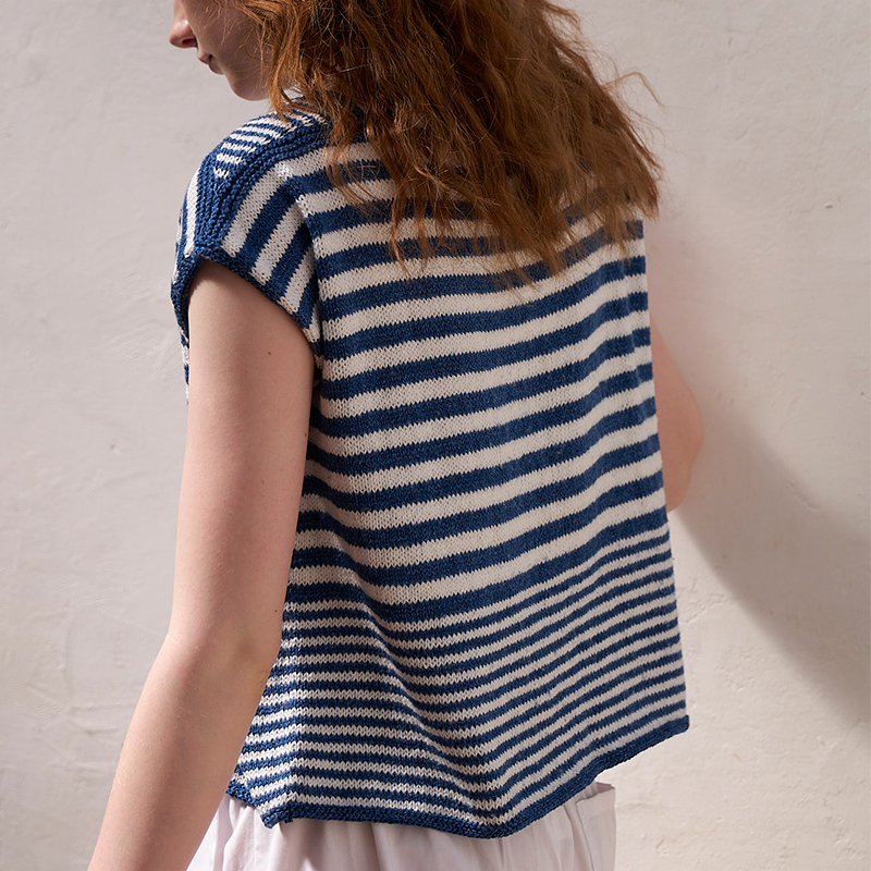 簡単に編んでTシャツのように着られるまっすぐ編みのボーダーニットは、直線のスラッシュド・ネックに三角マチをプラスして、オシャレ度&着やすさアップ! 太さを変えたボーダーが、都会的なマリンスタイルを演出してくれます。