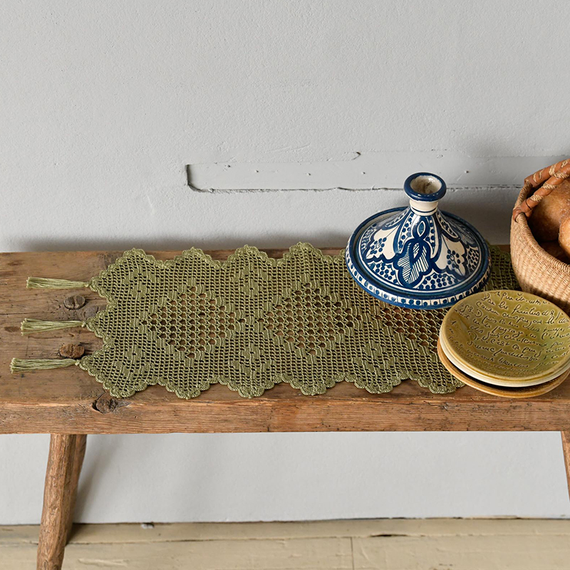 見慣れたテーブルや棚にレースのランナーを飾って、いつもの場所をちょっとだけ非日常にイメージチェンジ。方眼編みをベースに、様々な長編みで空間を埋めて模様を作るデザインは、いろいろなアレンジも楽しめます。インテリアになじむ色を探すのも一興です。
