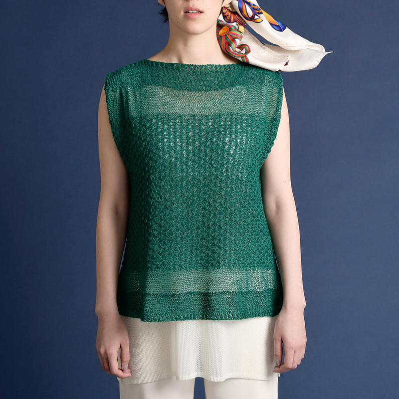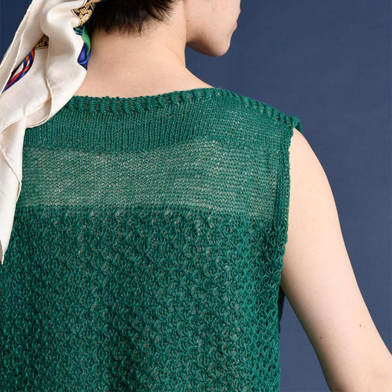 深呼吸したくなるような鮮やかなグリーンが爽やかなウエア。編み糸の本数を変え、ゲージ調整をすることで独特の夏らしい透け感をデザインしています。メインの穴あき模様も上品な、大人に似合うキレイめカジュアルです。