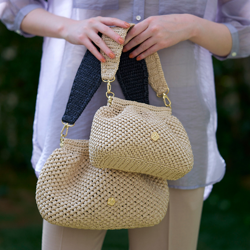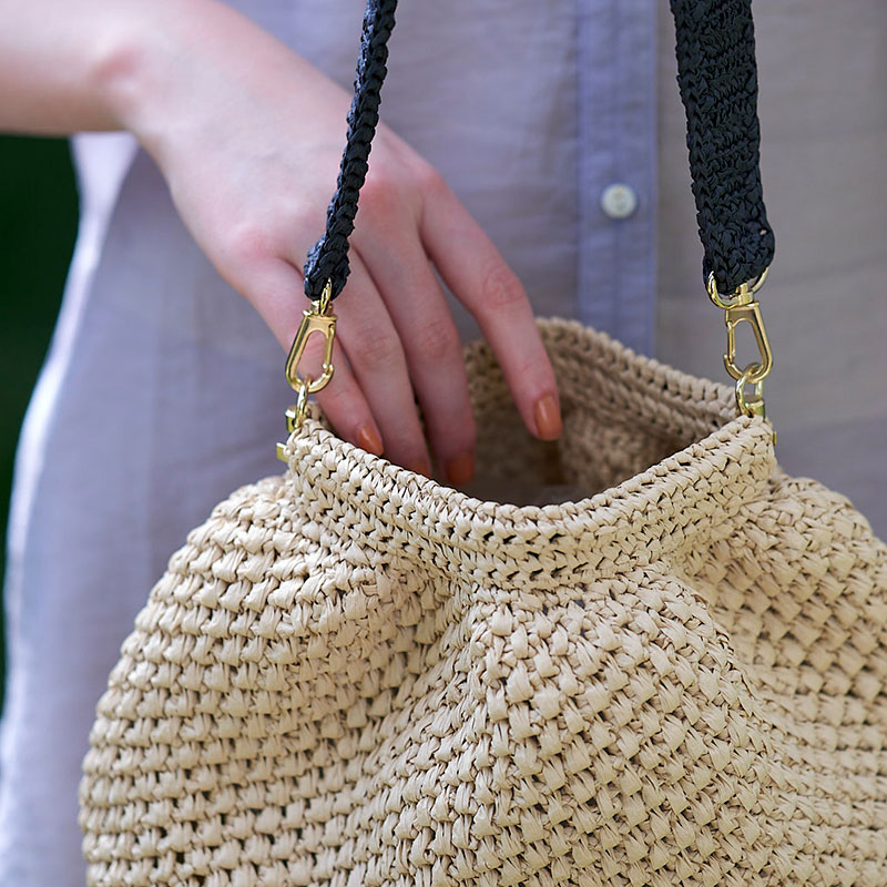 大きなバッグは、ストラップを肩にかけられる長さにして、さらに便利に。あえて本体と違う色で編むことで、おしゃれ度がぐんとアップ! 配色したり、素材を変えたりと、まだまだいろいろなアレンジが楽しめそうです。