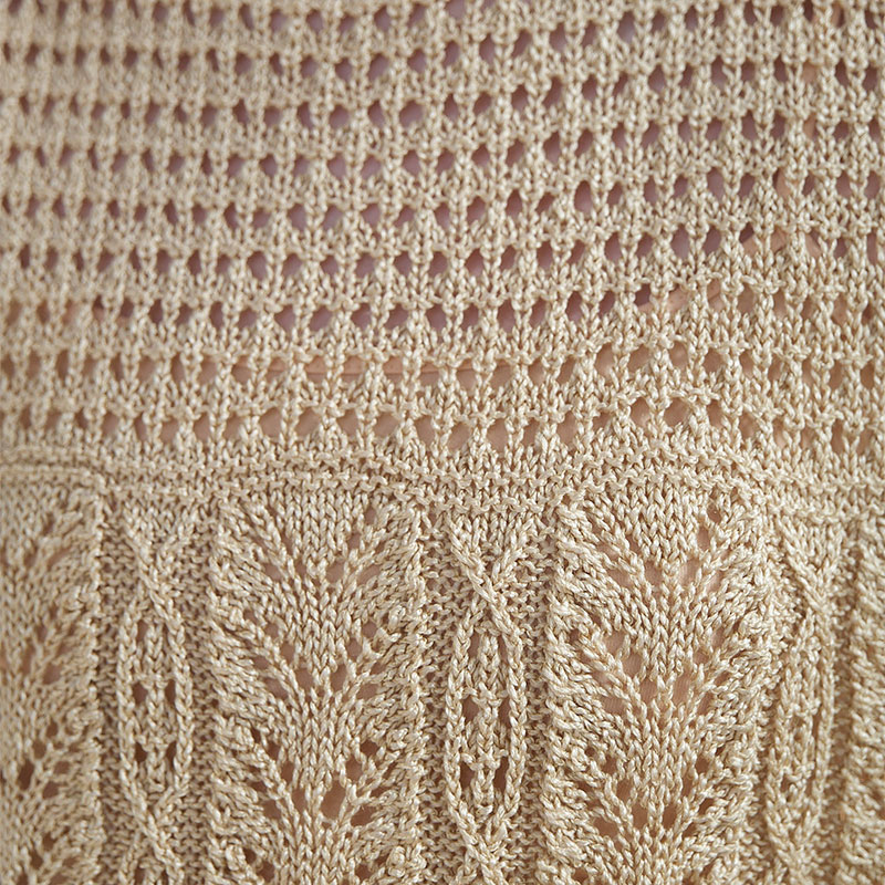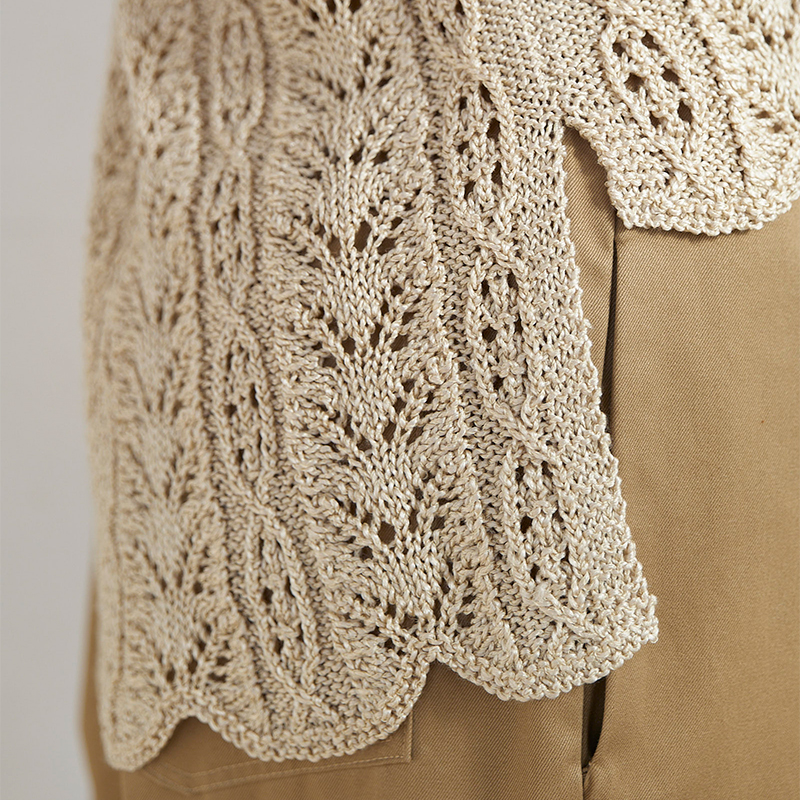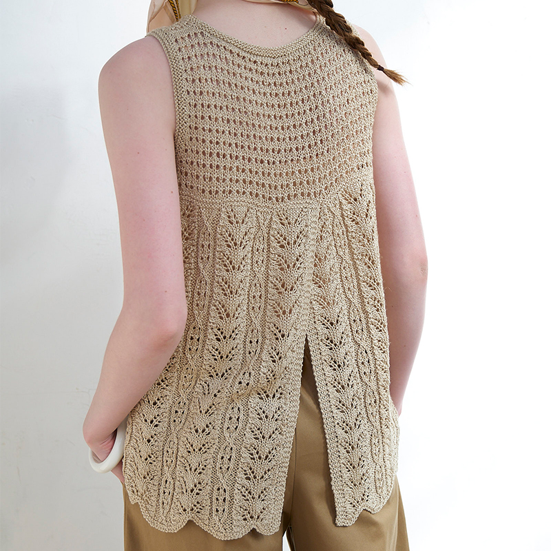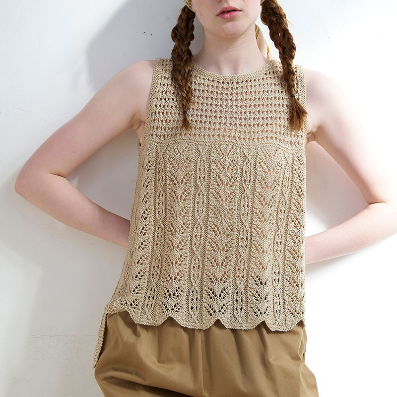 「クチュール・ニット春夏5」から、模様が横に並んだ寄せ目レースのフレンチプルオーバーをアレンジ。模様を縦に配置して、ディテールにもこだわってみました。このコーナーでは初めての、スリーブレスプルオーバーをご紹介