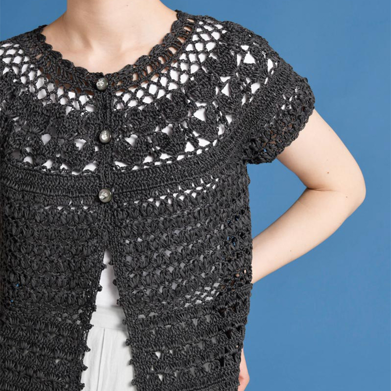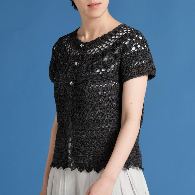 かぎ針編みのカーディガンは肩の凝らない丸ヨークで。 ハートを並べたようなデザインがキュートです。