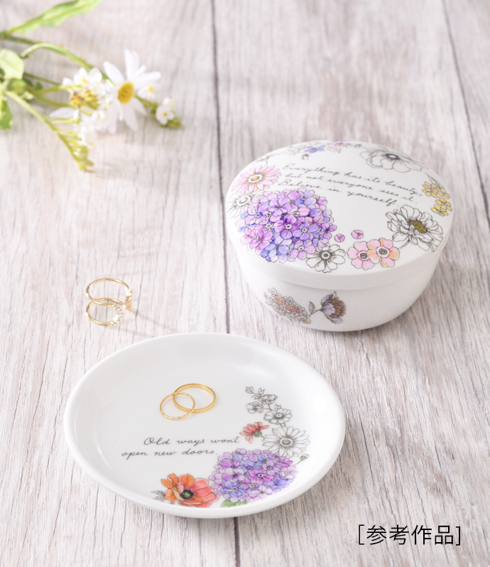 絵柄の輪郭線が焼き付いた白磁と絵の具・専用溶剤のセットです。塗り絵感覚で気軽にポーセリンアートを楽しめます。