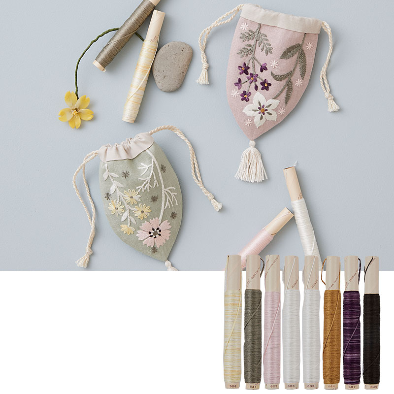 ステッチイデーvol.37 25ページ掲載の作品に使用した、シルク100%の刺しゅう糸「ソワエ」をセットでお届けします。上品な光沢とやさしい風合いが作品を品良く彩ります。