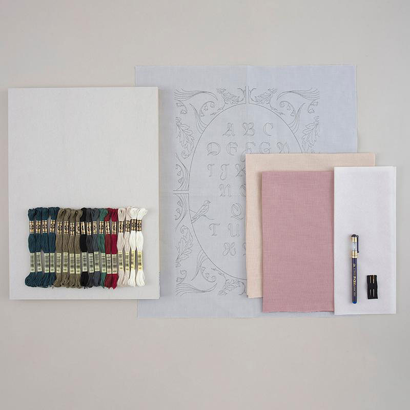 キットにはアルファベット刺繍パネルと封筒型ポーチに必要な材料をセット。刺繍に必要な刺繍糸と針、の他、モノグラム刺繍の図案を写すために適した図案写し専用のトレーシングペーパー(ムーンベル)と水性チャコペンもセットされています。