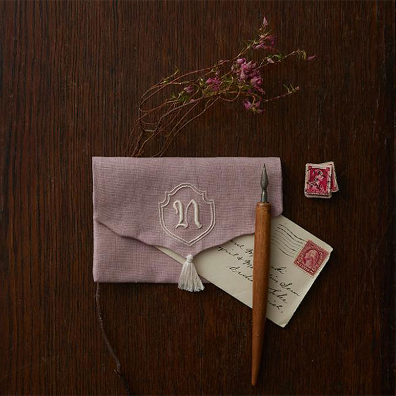 芯入りのサテンステッチでふくらみのあるアルファベットの刺し方を学びます。封筒型ポーチのタッセルポーチでは、タッセルをバリオンステッチでとめるテクニックも紹介しています。