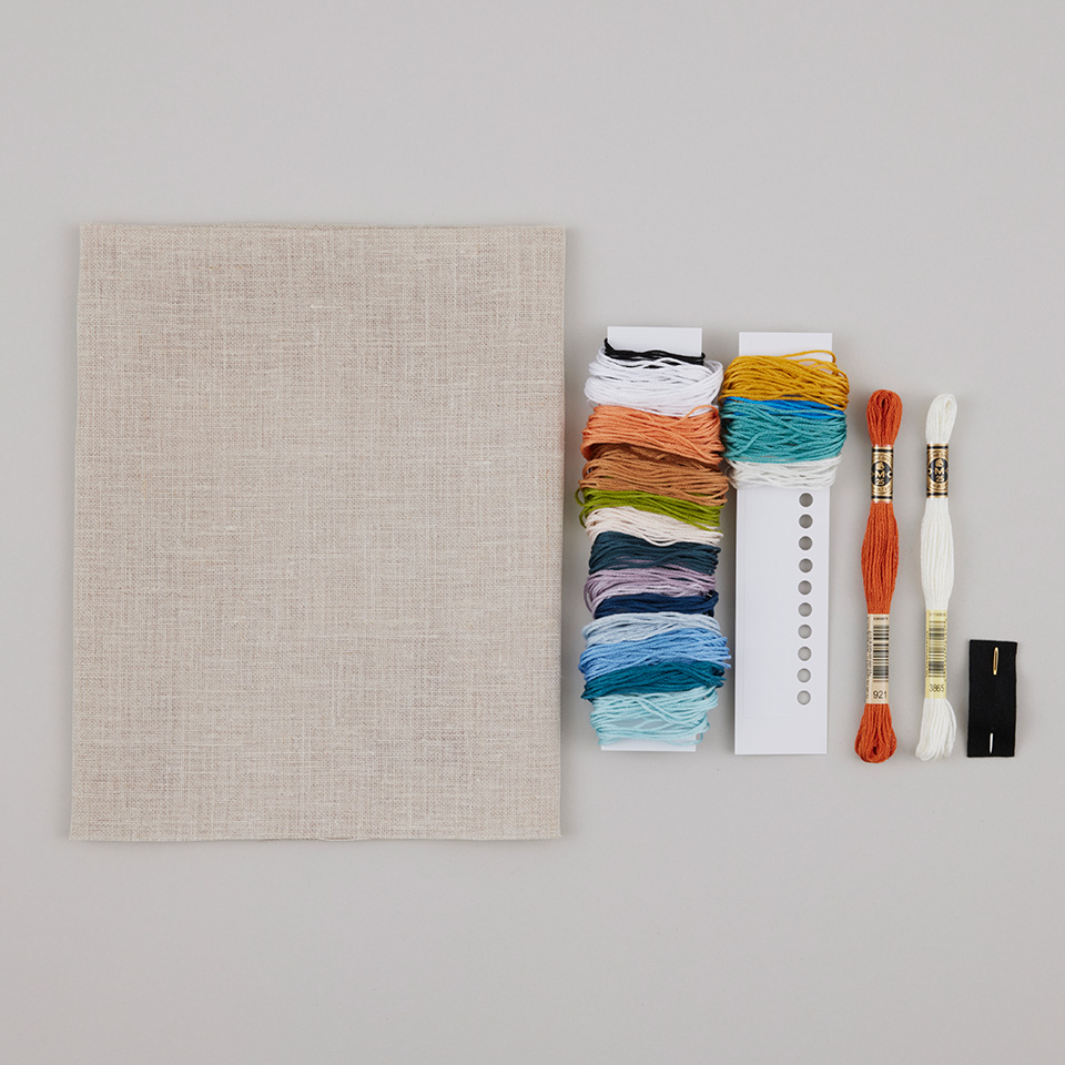 ナチュラルな色のリネンに刺して繊細な作品に仕上げます。北欧カラーの刺しゅう糸で、1つ1つのモチーフごとに完成させていきましょう。クロスステッチ図案付き。
