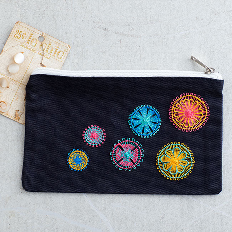 ▼まるモチーフのポーチ ポーチ:約13×20.5cm、モチーフ:約2.5~4cm