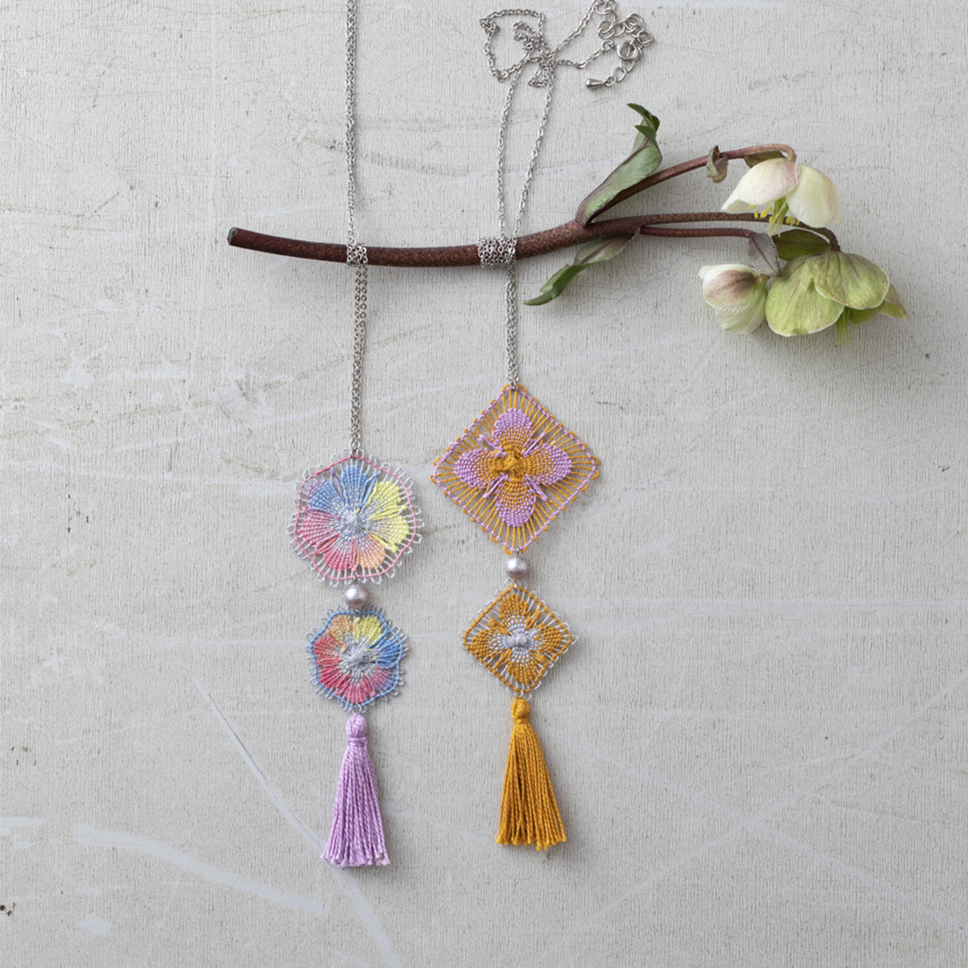 ▼花モチーフのペンダント ネックレス:約40cm(チェーン全長約55cm) モチーフ部分:マーガレット約4×11.5cm(タッセル含む) ジャスミン約4.5×12.5cm(タッセル含む)