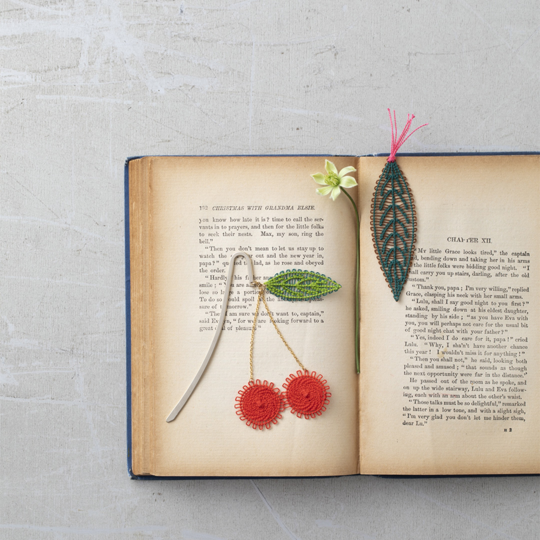▼さくらんぼと葉のモチーフのブックマーカー 〈さくらんぼ〉ブックマーカー金具:約全長11cm モチーフ部分:約5.5×8.5cm 〈葉のしおり〉モチーフ部分:約2.7×8.5cm