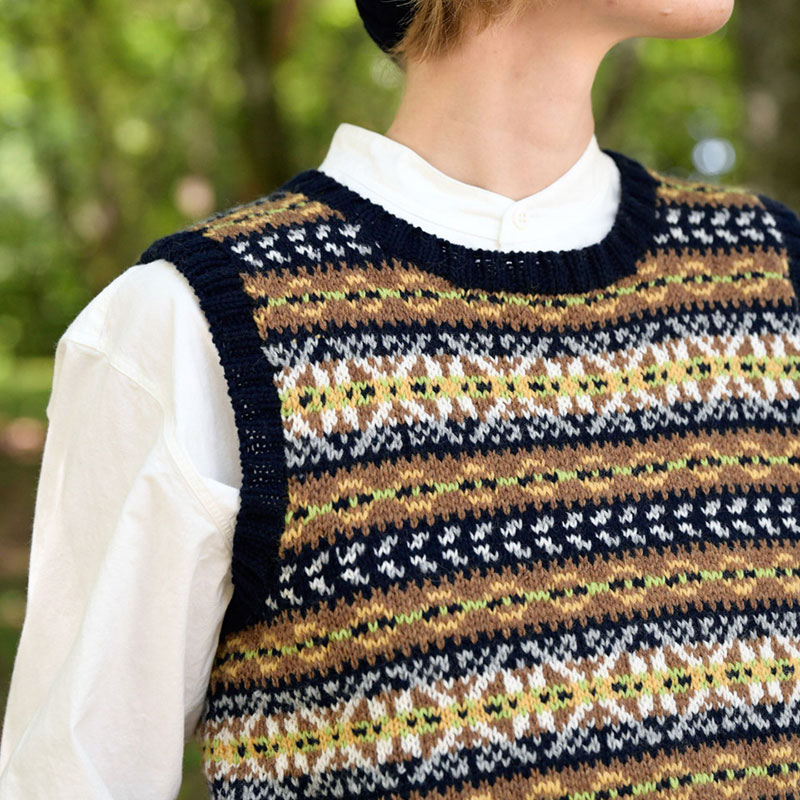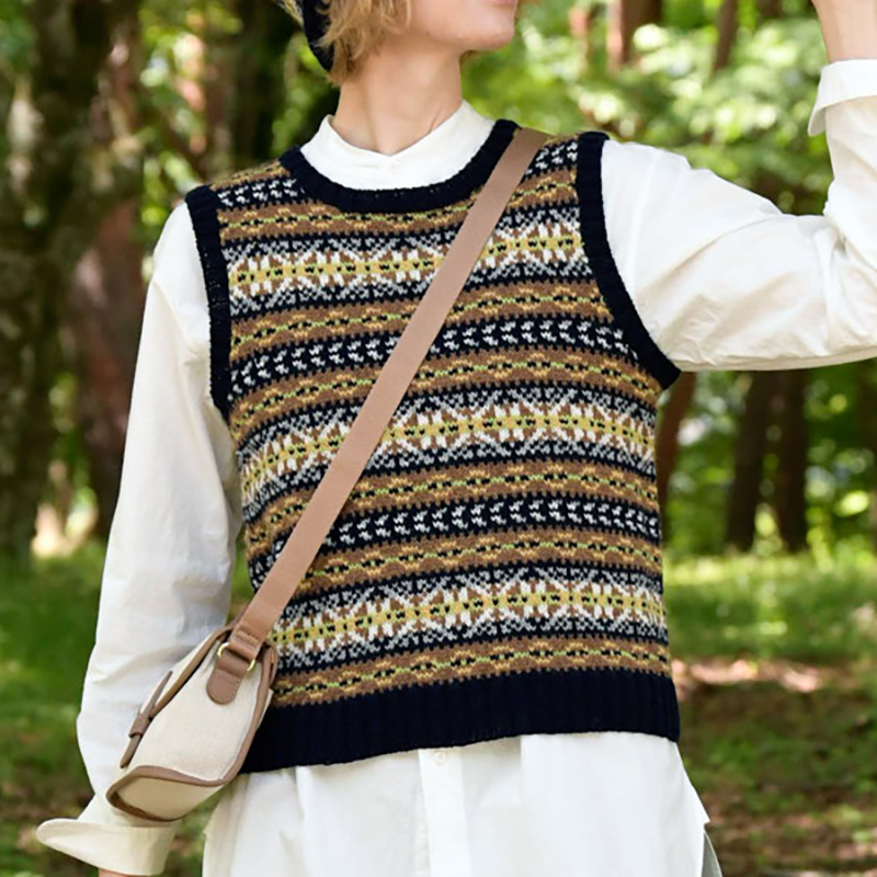 細めのウール糸でベストとキャップをお揃いで。茶系を濃紺で締めているので、茶系・黒系どちら系統のスタイリングにも合います。シェットランドヤーンにはない柔らかな肌触りはお肌の弱い方にもおすすめです。※こちらのレシピはベストのみです。 レシピ 編み物 あみかた 編み図 ベストとノースリーブ 河合真弓 紺・茶色系フェアアイルのベスト 毛糸だま2022年秋号vol.195