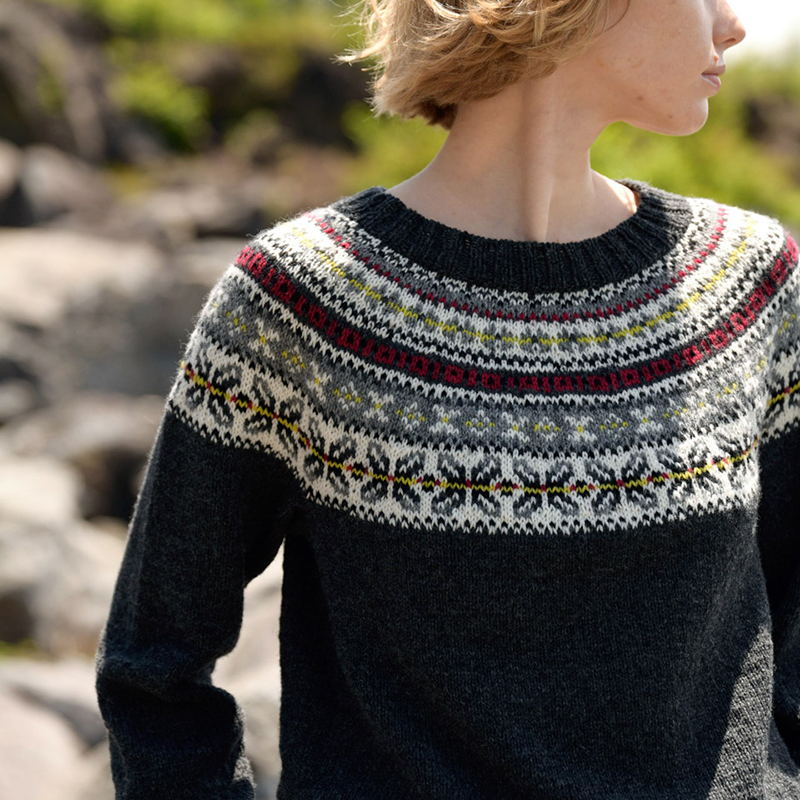 可愛らしさのある丸ヨークは本来のフェアアイルニットにはなかったものですが、海を通じて北欧から伝わってきたデザインに強く影響を受けています。柔らかいウールで編んでいるので、薄手で着やすく、肌触り良く仕上がりました。