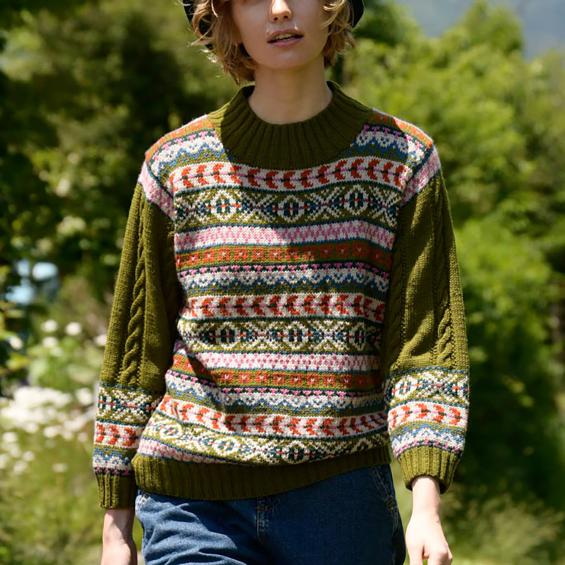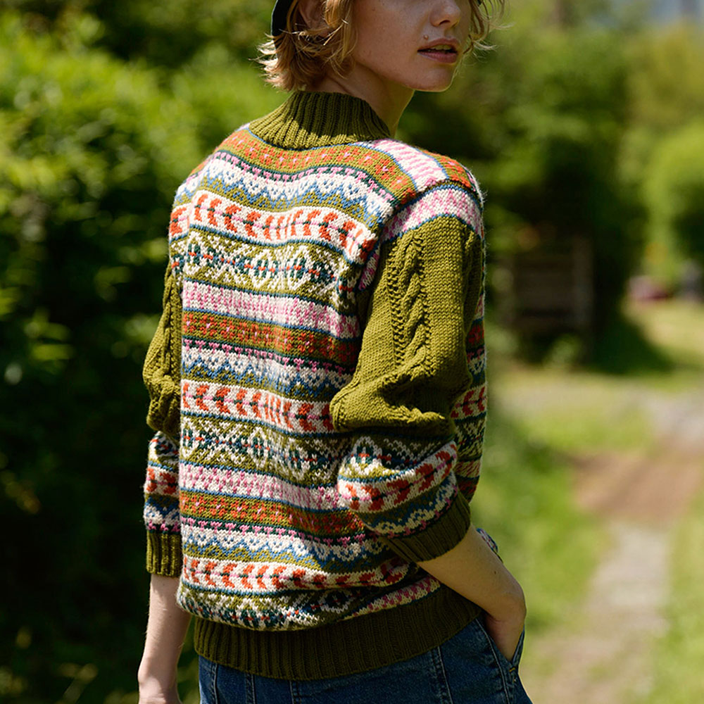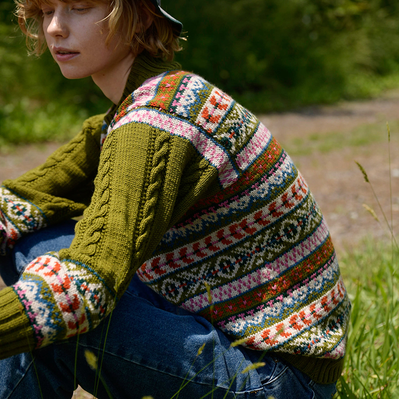 フェアアイルのパターンに別の編み地を合わせるのも素敵です。前後身頃は編み込み模様、袖にはメリヤス編みとなわ編みを組み込んで。タスマニアンメリノで編んでいるから、素肌にそのまま着られます。