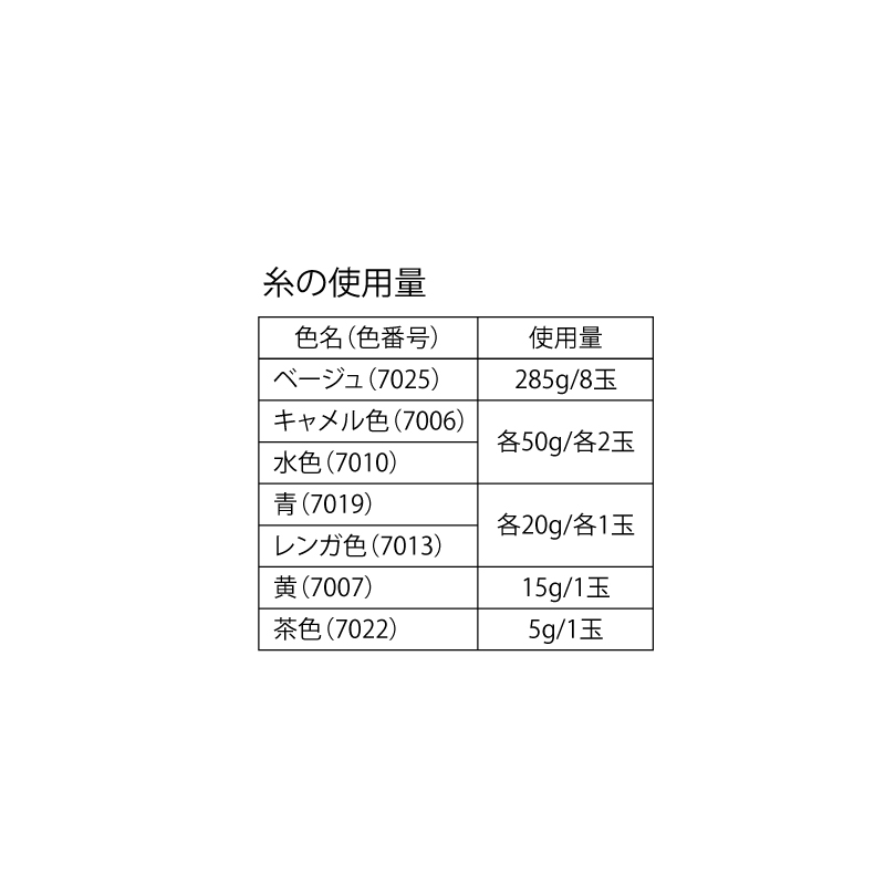材料:スキー毛糸 スキータスマニアンポロワース オリーブグリーン(7021)210g/6 玉、ベージュ(7025)105g/4玉、緑(7020)40g/1玉、ピンク(7011)・レンガ色(7013)・青(7019)各35g/ 各1玉。