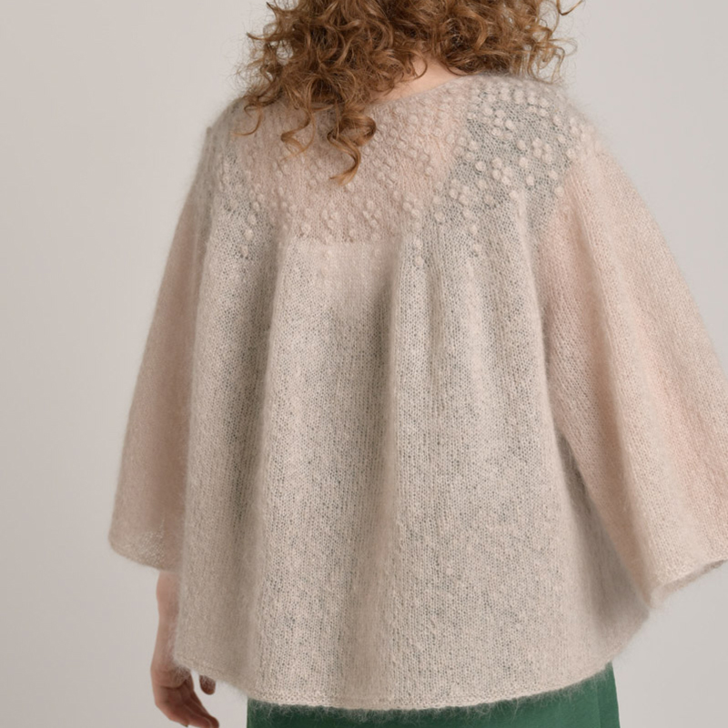 レイヤードスタイルにぴったりの軽くてあたたかなプルオーバー。糸は細いですが、針は5号なので編みやすくて意外と進みます。たっぷりとしたフレアにボッブルの、甘さのあるデザインですが、辛口のコーディネートに合わせても柔らかさを添えてくれます。