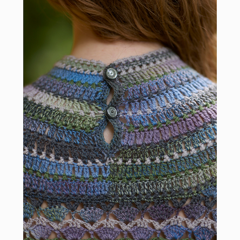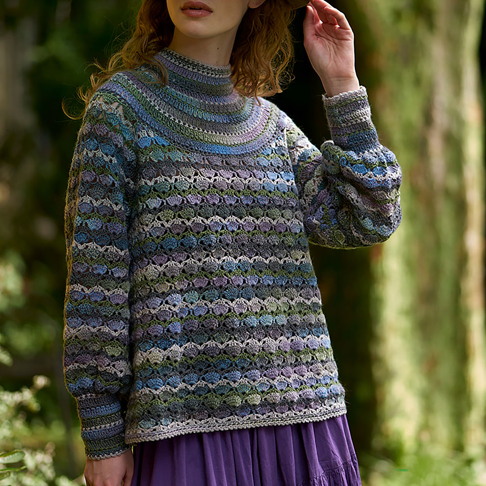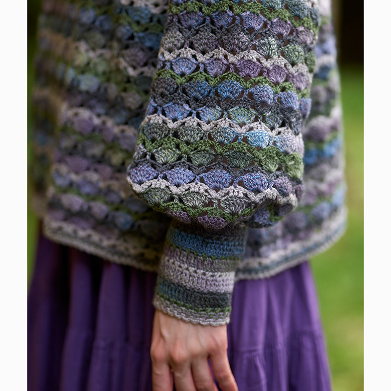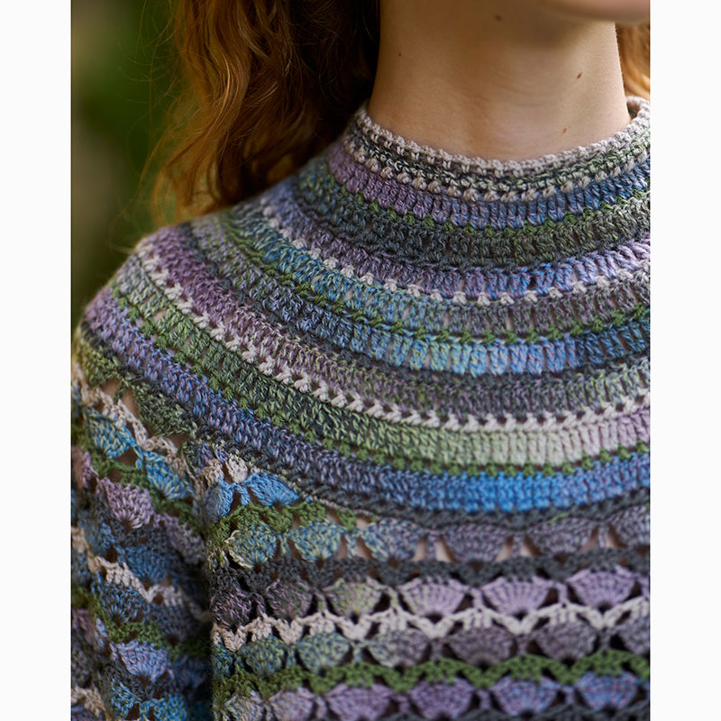 段染め糸のグラデーションも、かぎ針編みと棒針編みではずいぶんと違って見えるもの。美しいヨークがポイントのウエアは、段染め糸と単色糸を縞に配色しています。グラデーションの多彩な色味を単色が引き締め、効果的なアクセントに。
