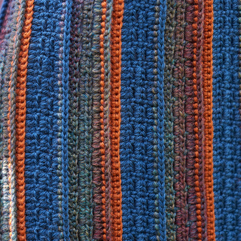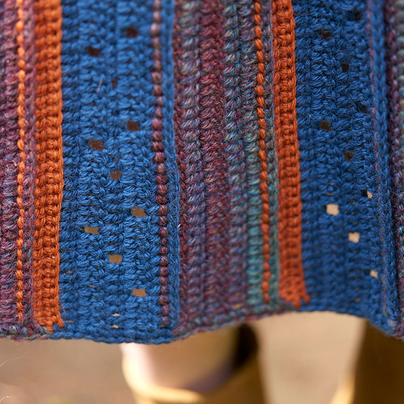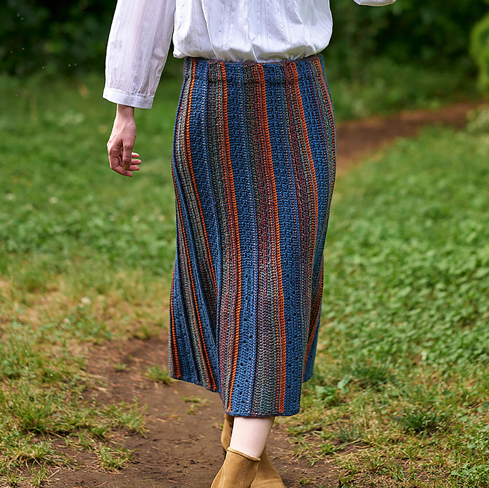一度は編んではいてみたい、毛糸のスカート。細編み、中長編み、長編みと順に横編みで編んでいくだけで美しいラインができあがります。引き上げ編みのラインやところどころに配した方眼編み、凝った配色も魅力です。