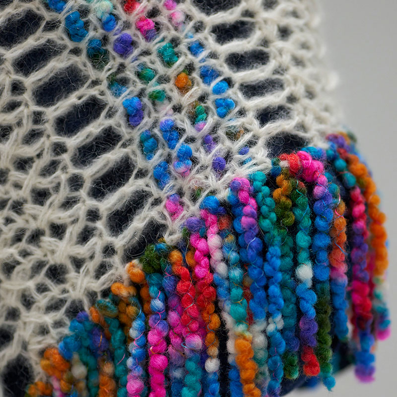 材料:Keito カラモフ 生なり(000)85g/1カセ。ウミウシ ポコポコ ピンク・青・オレンジ色系段染め(103)85g/1カセ。