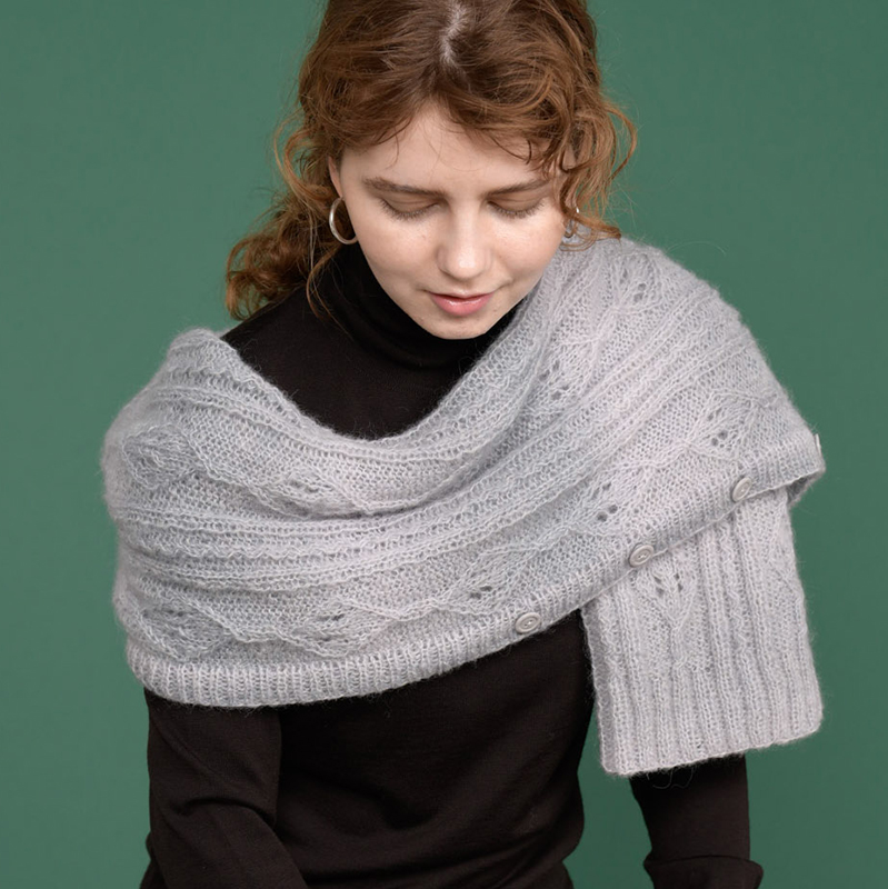 モヘア&アルパカ入りの糸で編んだロング丈のベストに、お揃いのシュラッグを合わせた極軽極暖のセット。シュラッグはボタンをはずしてショールとしても楽しめます。ロンググラデーションの変化が、より映えるデザインです。