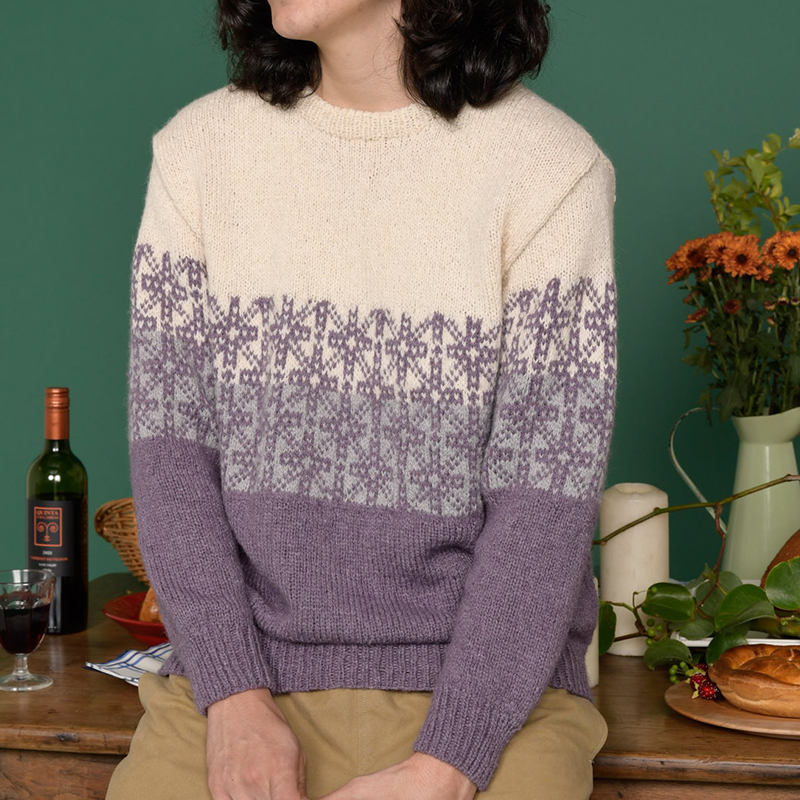 シックな配色が男前を上げてくれる、おしゃれなプルオーバー。アルパカ混のウールをリリヤーン仕立てにした糸の本領発揮! 編み込み模様が入ったメンズニットとは思えないほどの軽い仕上がりに驚かされます。