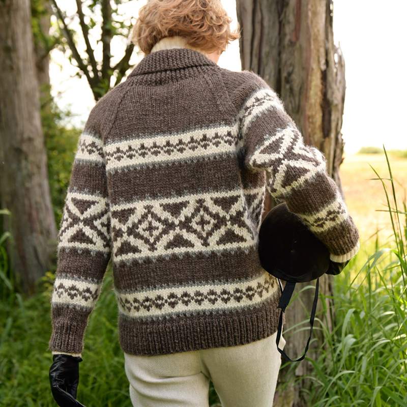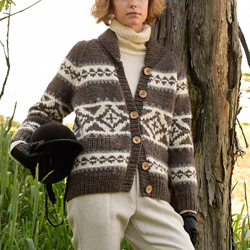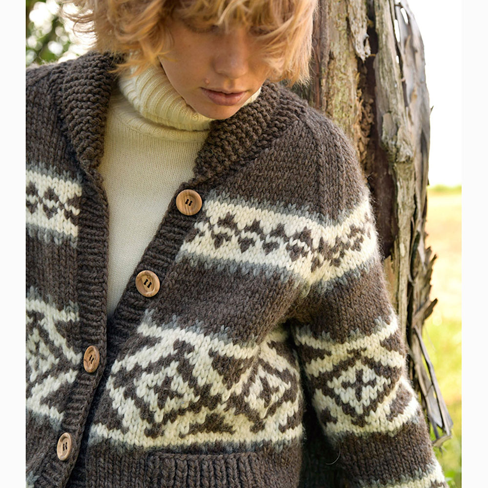 カウチン風のモチーフをスマートに編み込んだトラディショナルなジャケット。前後身頃やヨークは続けて編み、袖は輪に編んでいるので、とじはぎはかなり少なめ。太糸ならではの始末いらずの心遣いが嬉しいデザインです。