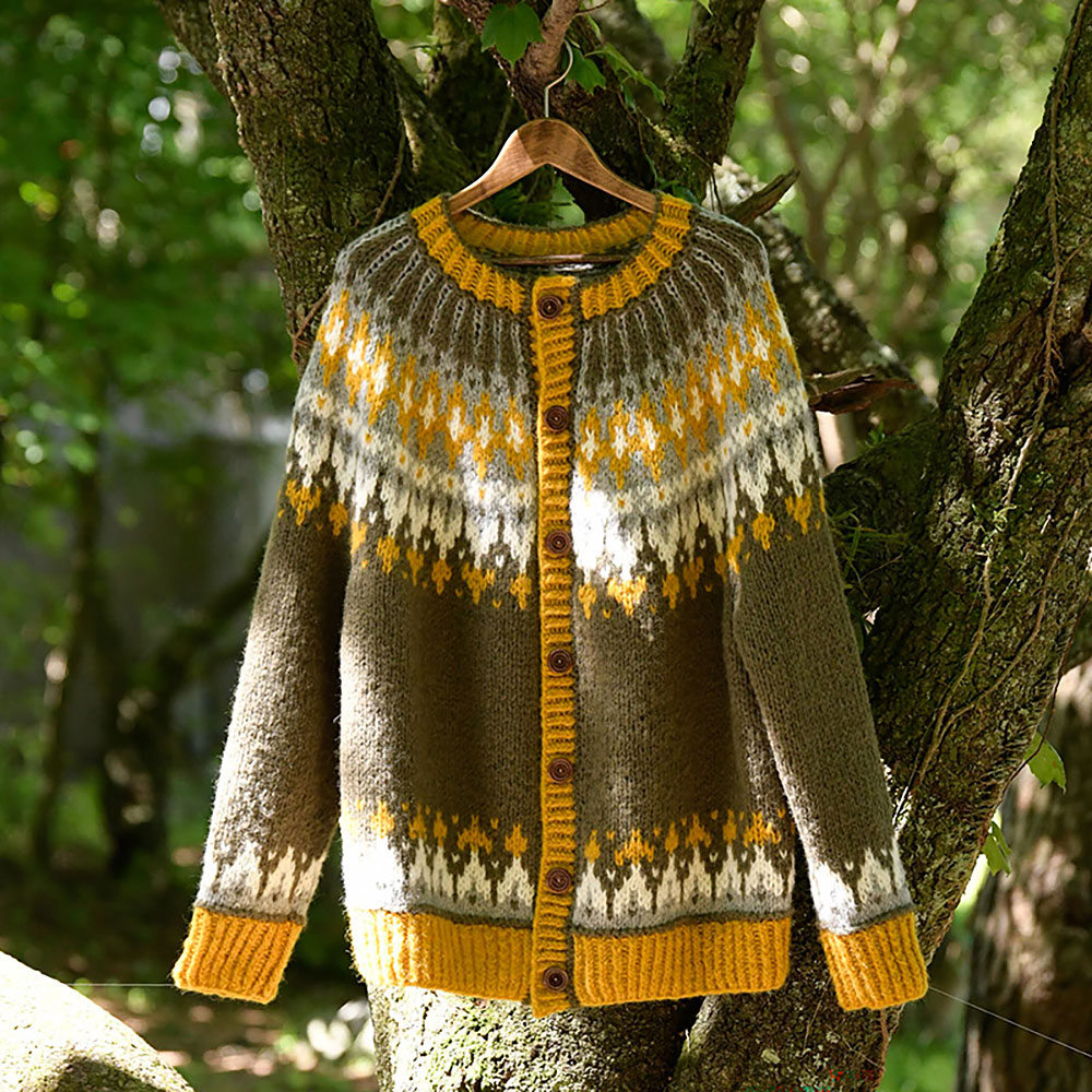 材料:DARUMA ウールタム オリーブ(3)325g/7 玉、マリーゴールド(2)150g/3 玉、ライトグレー(5)80g/2玉、きなり(1)60g/2 玉。直径25mm のボタン7個。