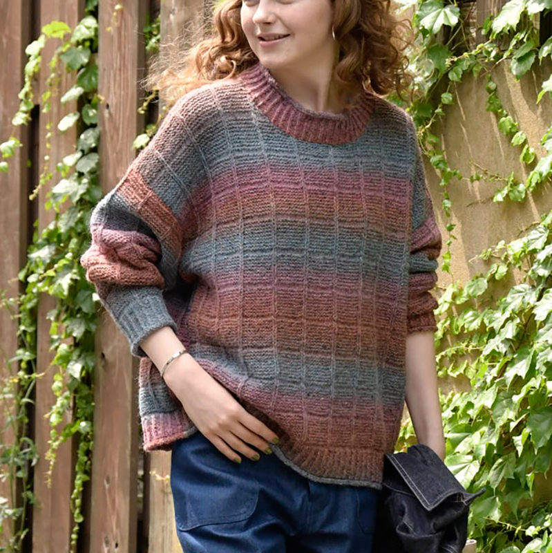 すべり目表目のラインで、ガーター編みのベースを格子状に仕切ったデザインは、ストンとした大きめシルエット。メンズライクな模様編みも段染め糸で柔らかな印象に。トレーナー感覚で着こなせます。