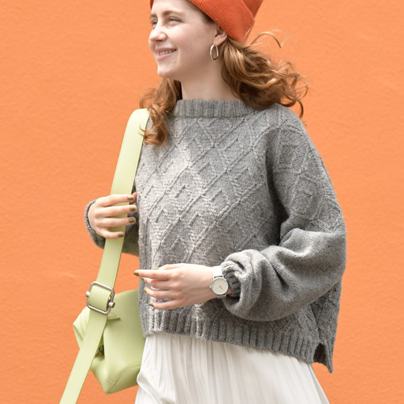 1目交差で作るダイヤを重ねたような立体的な模様がカッコいいプルオーバーは、すっかり定番になったビッグシルエットで。幅広の身幅に合わせて衿も広めにし、袖は裏メリヤス編みですっきりと仕上げました。
