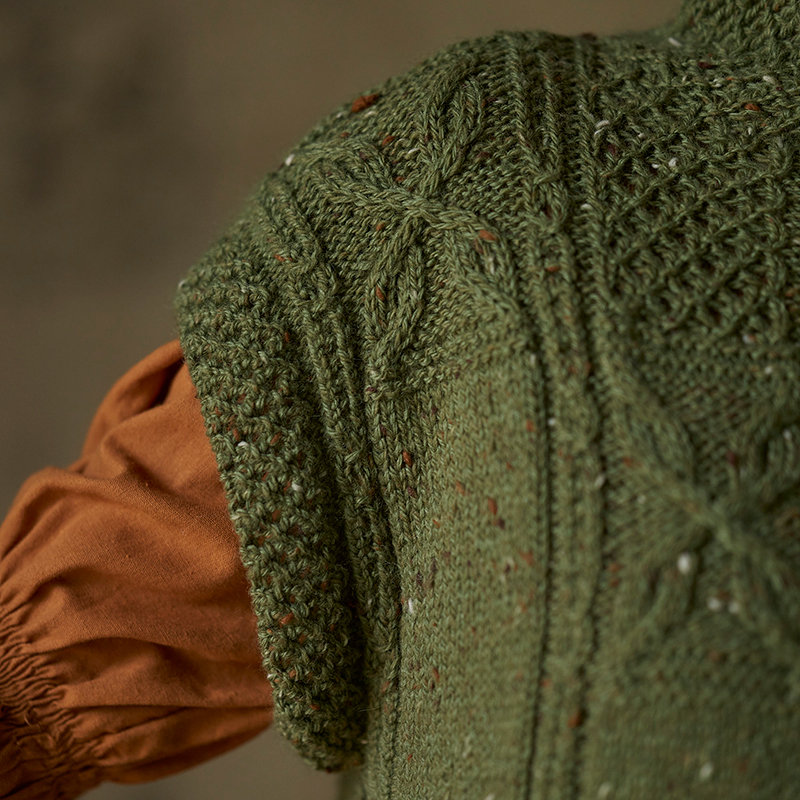 「クチュール・ニット18」より、チュニックプルオーバーをベストにアレンジ。 四角の中に花びらのように配した交差模様は、裾は大きく、胸元は少し小さくしています。 脇は大きくあいている部分を、タブとボタンで止めてみました。ボタン穴の位置は、お好みの重なりになるように変えてください。