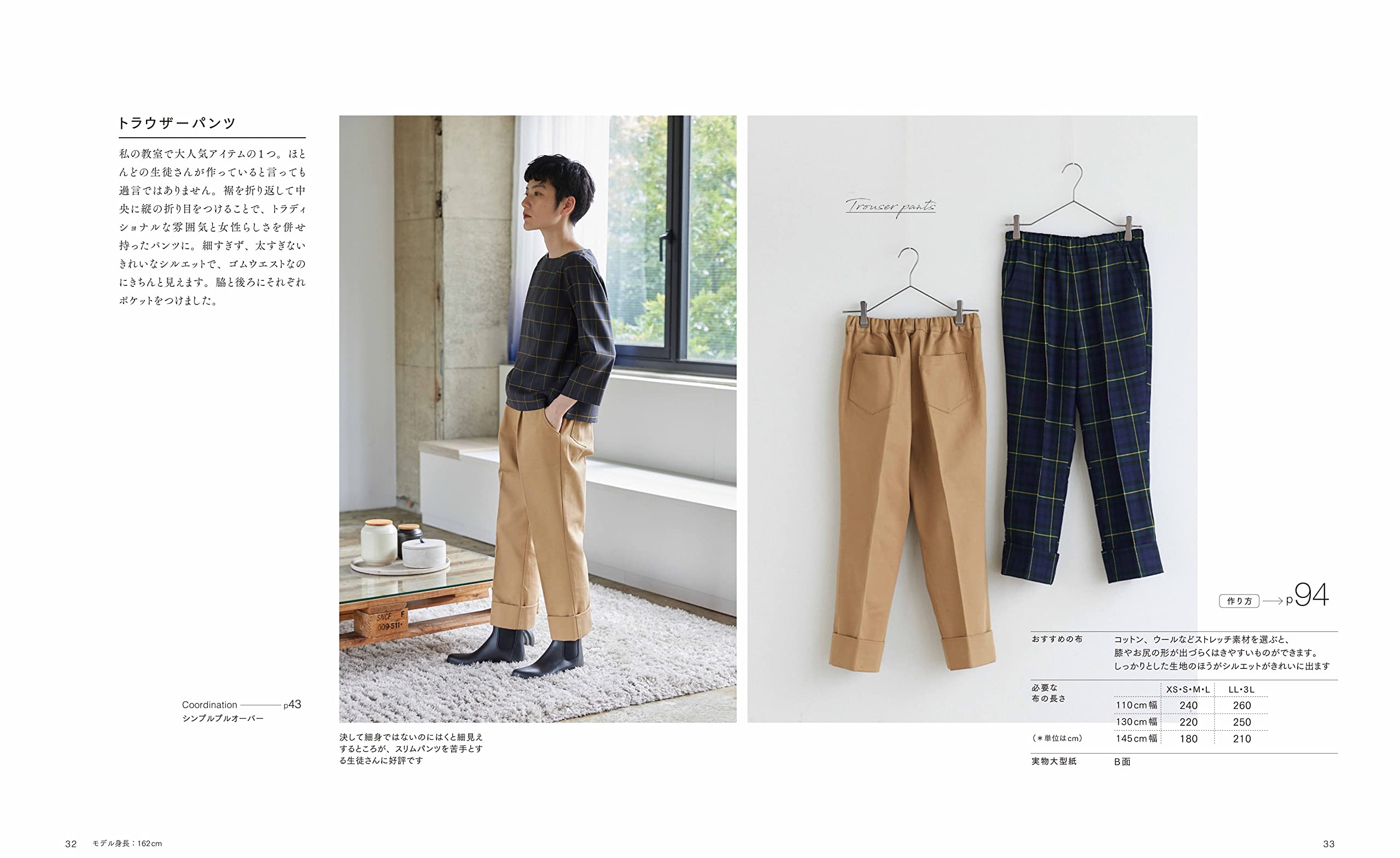 「大人にいい服」「ちょっとよそ行き」の増補改訂版。2冊の中から特に人気の高いものをピックアップし、新作5作品を追加した1冊。”早く、ラクに作れてかっこいい”を掲げている著者ならではの、すぐに作って着て楽しめる作品が満載。各作品を作るのにおすすめの布や、110cm幅・130cm幅・145cm幅の布を使用して作る場合の必要な布の長さものせているので、布を買うときや手持ちの布で作るときに便利です。サイズはXS/S/M/L/LL/3Lの6サイズ展開。さまざまな体型の方に楽しんでいただけます。トップス16点、パンツ7点、ワンピース・ジャンパースカート8点、ジャケット2点の合計33点を掲載。縫い代込みの実物大型紙3枚つきです。