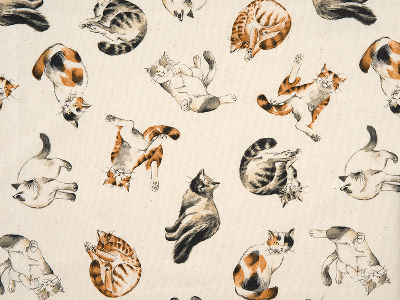 綿殻入りのナチュラルな生成り地に、ちょっとリアルでシニカルな表情のネコたちをプリント。バッグやインテリアなど、いつも一緒にいられる作品用に