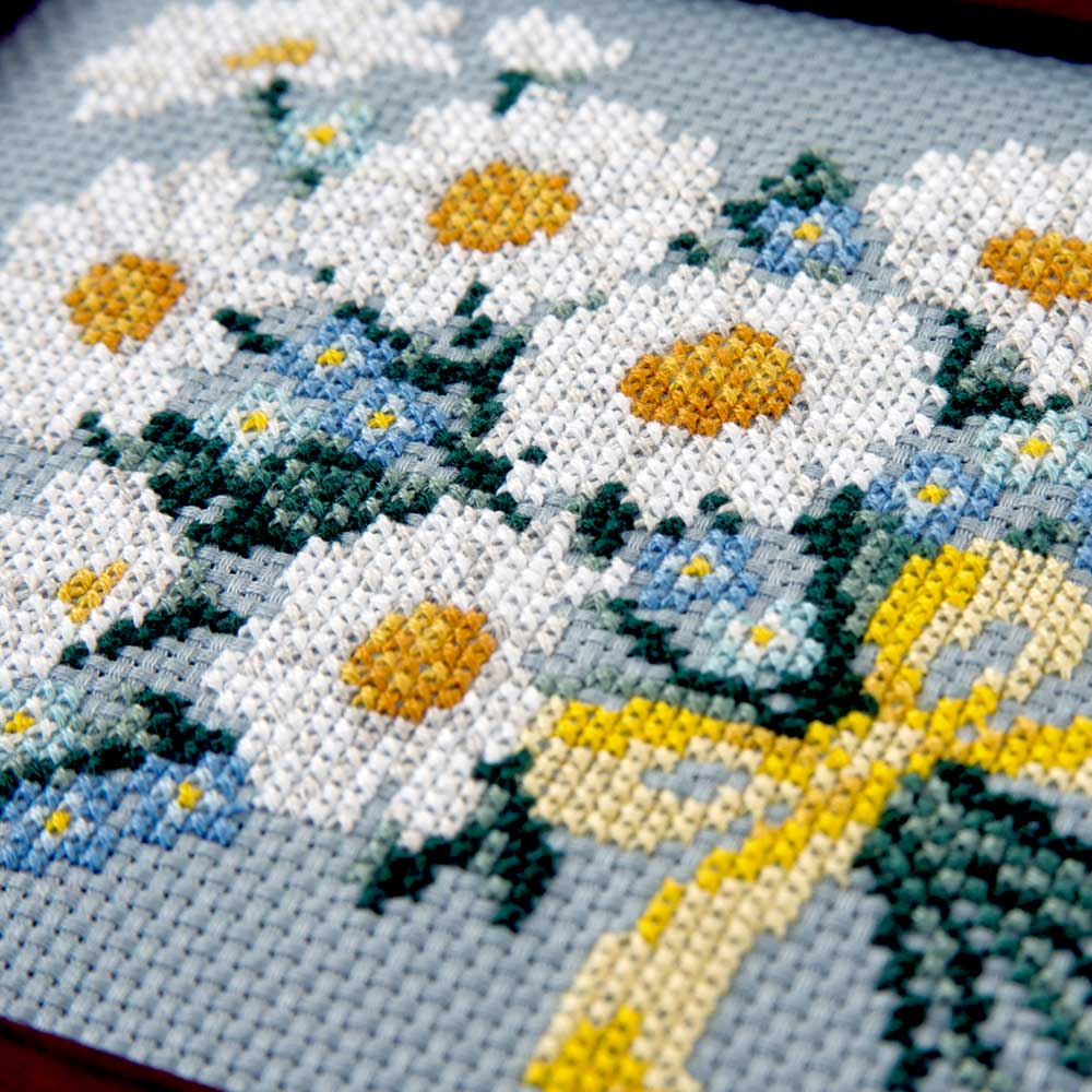 [フレームつき]【キット作り方つき】お部屋を華やかに飾ってくれる、花のクロスステッチ作品です。グレイッシュなブルー地に白い花びらが映える可憐なデザインです。フレームつきなので、作ってすぐに飾れます。初~中級の方へ。