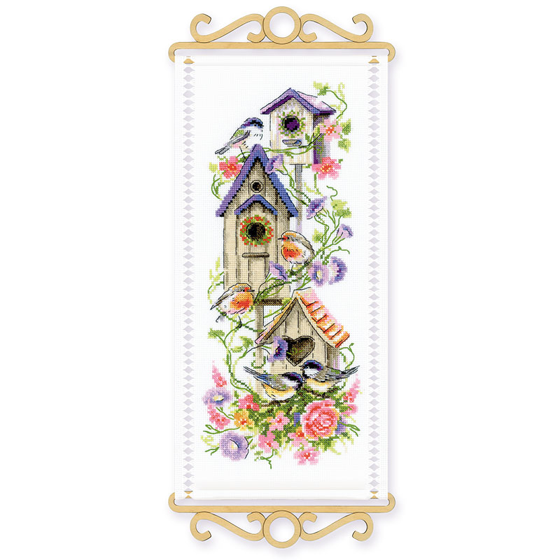 【キット作り方つき】新居に引っ越してきた小鳥たちのお祝いを、クロスステッチで描きました。両端をドロンワークでかがる、上級の方向きの作品です。