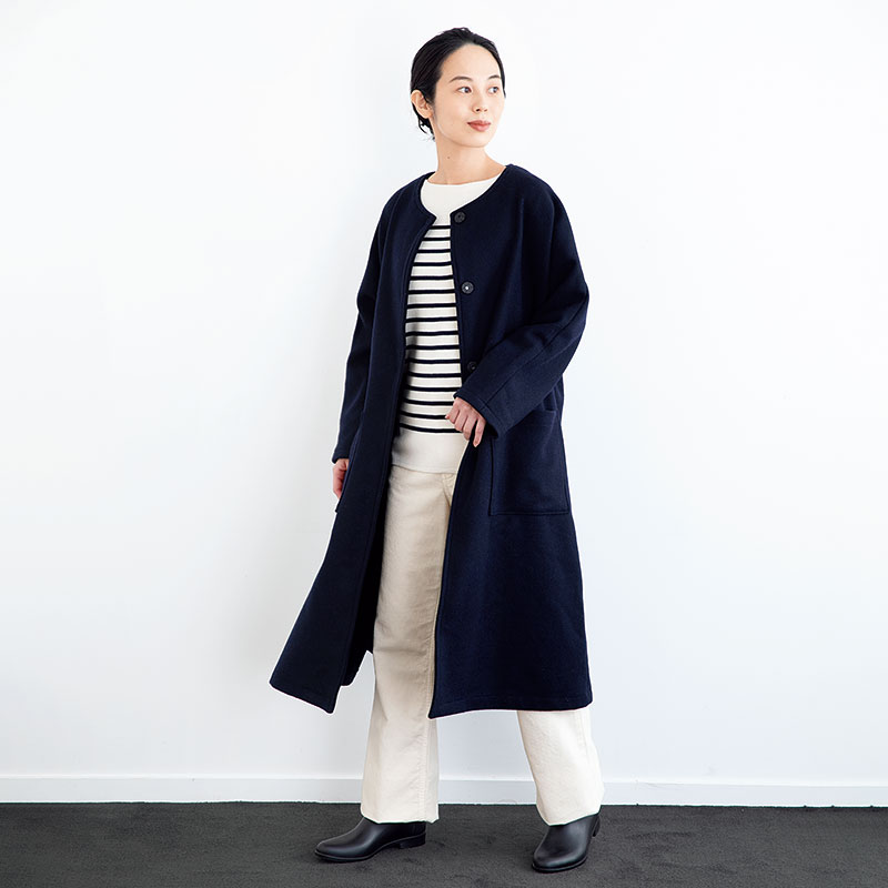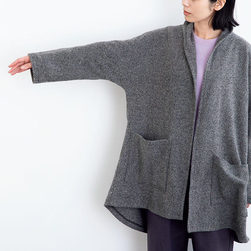 シンプルなドルマンスリーブのコートは、中に着る洋服を選びません。袖ぐりに余裕があるので、厚手のニットなどを着ても窮屈に見えず、腕も動かしやすいといいこと尽くし。おしゃれで楽に着られるのに作るのは簡単、そんな「あったらいいな」を叶えるコートです。ロングコートとショートコートが作れる型紙です。