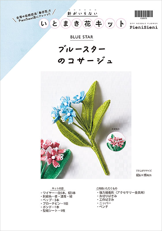 【キット作り方つき】PieniSieniさんの著書、「針がいらない いとまき花」に掲載の作品をキット化しました。ワイヤーや厚紙で土台を作り、糸を巻いて花や葉を作っていきます。ブルーの小花が可愛いコサージュです。