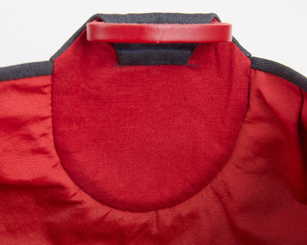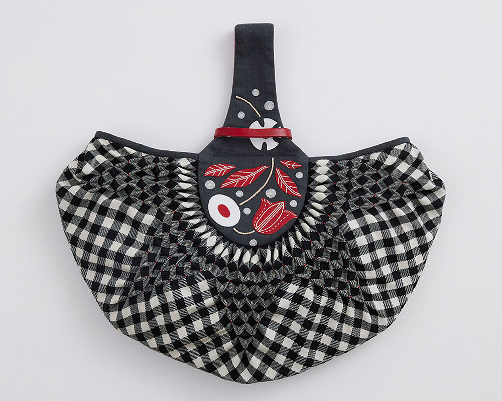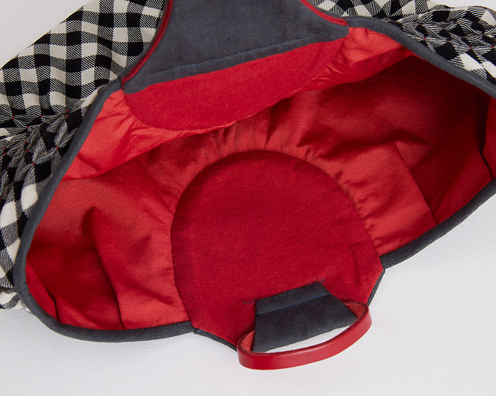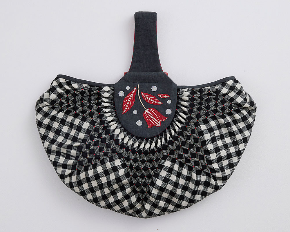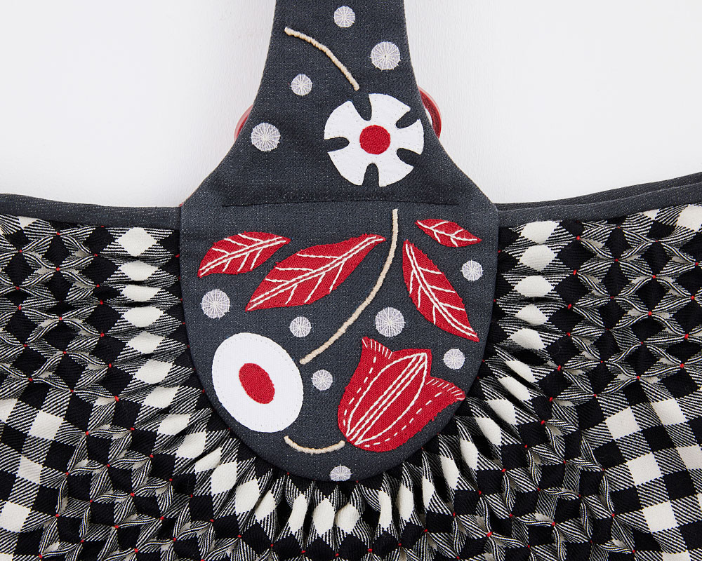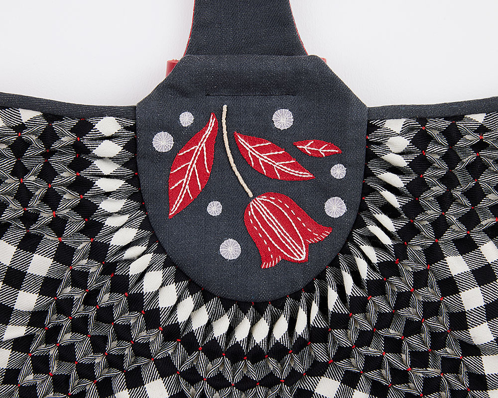 表布(ウール・ギンガムチェック) 、裏布(グログラン・赤)、持ち手表布(11 オンス デニム)、アップリケ布・持ち手裏布(綿麻キャンバス・赤)、アップリケ布(コットンキャンバス・白)、アップリケ布(コットンオーガンジー・白)、 刺し子糸(赤)、DMC#25(ECRU)、DMC コットンパール#8(842)、 麻糸、 ホワイトレーン16/3( ベージュ) 、革テープ(赤)、シャープ芯、接着芯、両面接着シート
