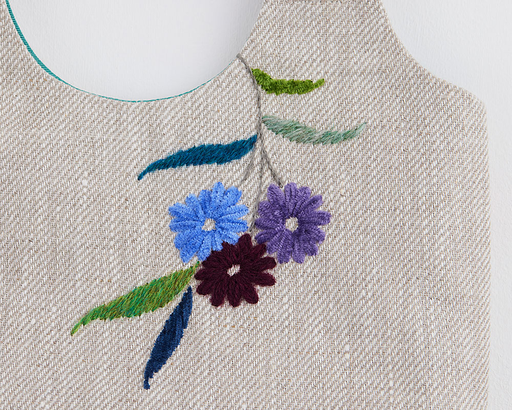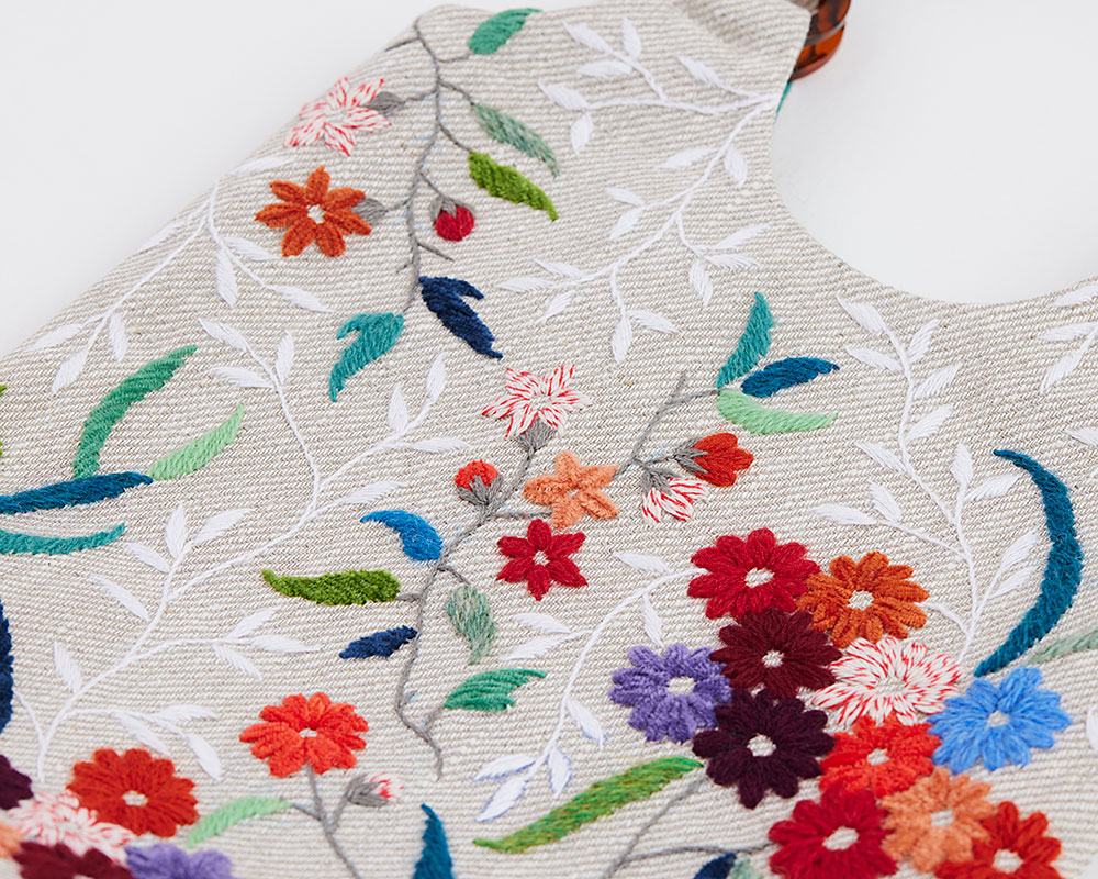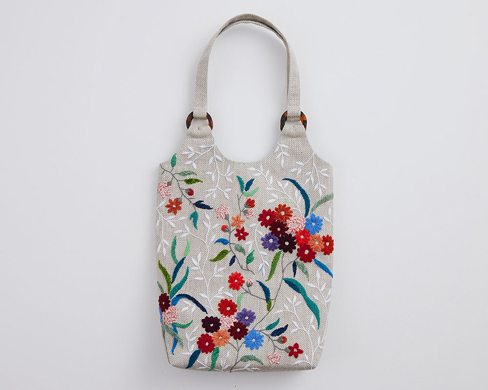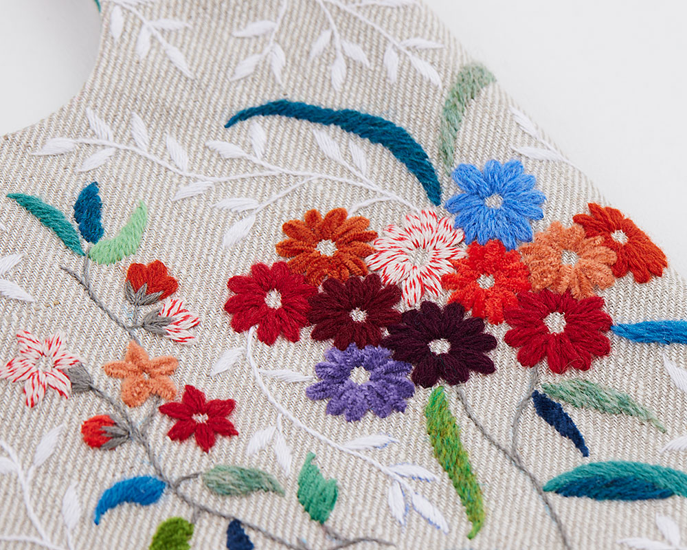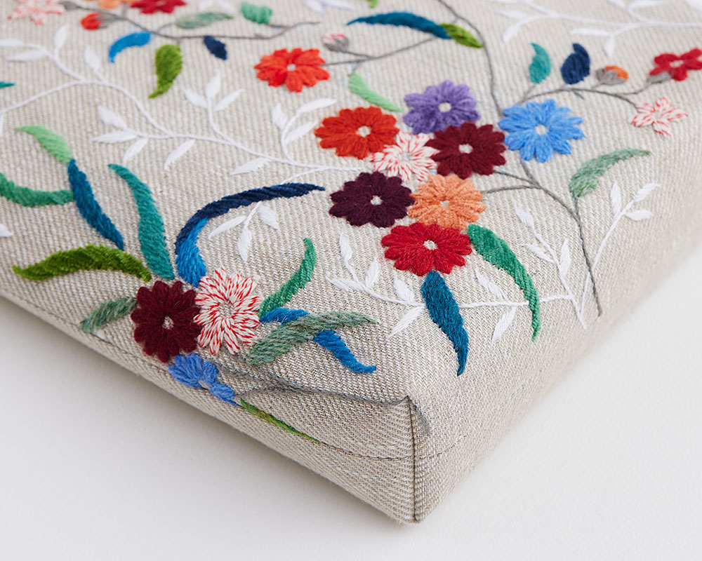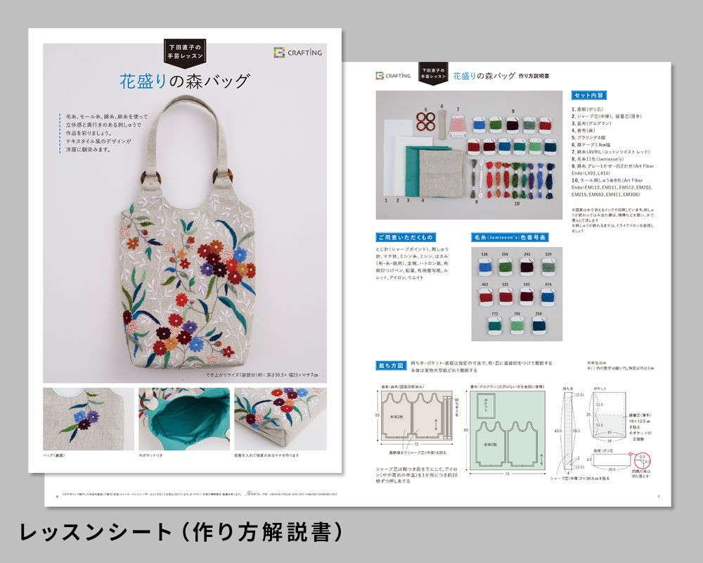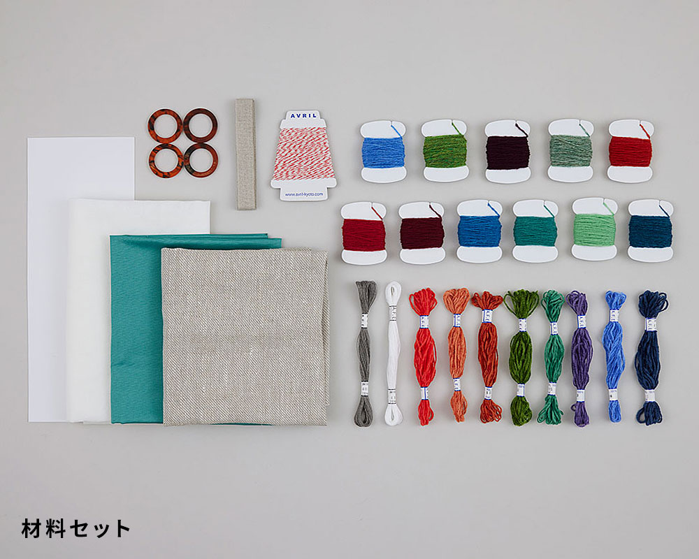 下田直子セレクトのハイクオリティな材料を撮り揃えました。 複雑な刺繍をするのに欠かせない厚手の高級麻布は、入手困難な限定品です。 裏地用には高級感のあるグログラン生地を使用。 また、Jamieson’sの毛糸は220色以上のカラーバリエーションの中から、色同士が互いに美しく響きあうように厳密に計算されています。 モール刺繍糸やコットンヤーン、麻糸も、この作品ならではの組み合わせ。布は図案印刷済みです。 (数量限定品)