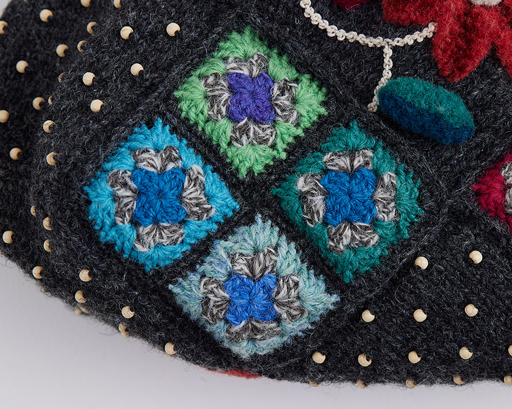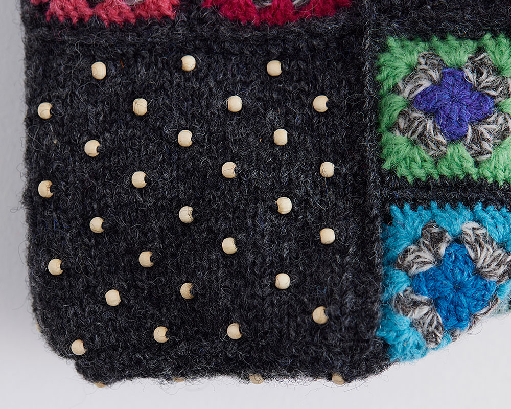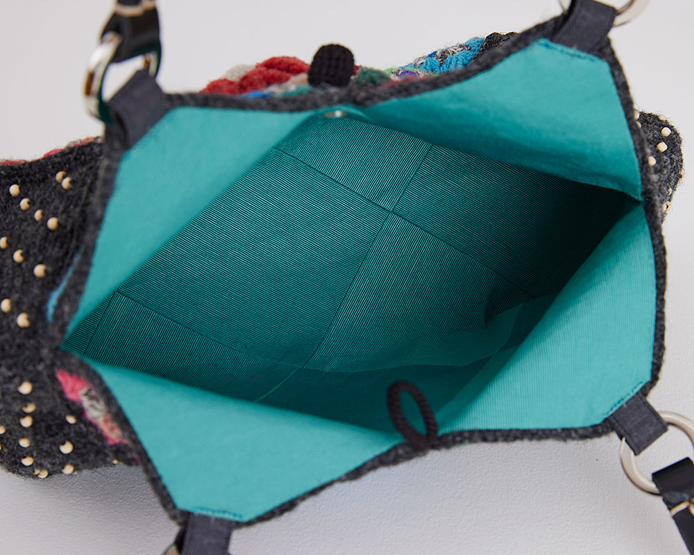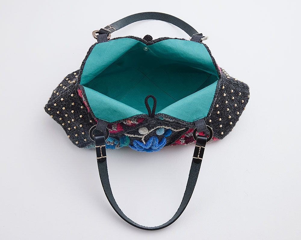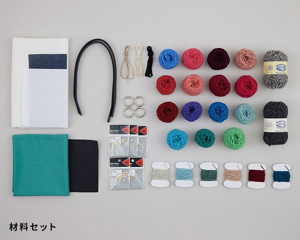 毛糸 Jamieson’s 24色(チャコールグレイは25g×4玉)、裏地(グログラン・ターコイズグリーン)、持ち手用デニム、シャープ芯(中厚)、薄手接着芯(紺)、ポリ芯(刺しゅう型用)、本革の持ち手(黒)1組、エナメルリング4個、麻糸(ホワイトレーン16/3)、たこ糸3号(生成り・黒)、チェコ製ウッドビーズ(約200個)、力ボタン(1個)、レッスンシート(作り方解説書)A4×10ページ、実物大図案・型紙1枚