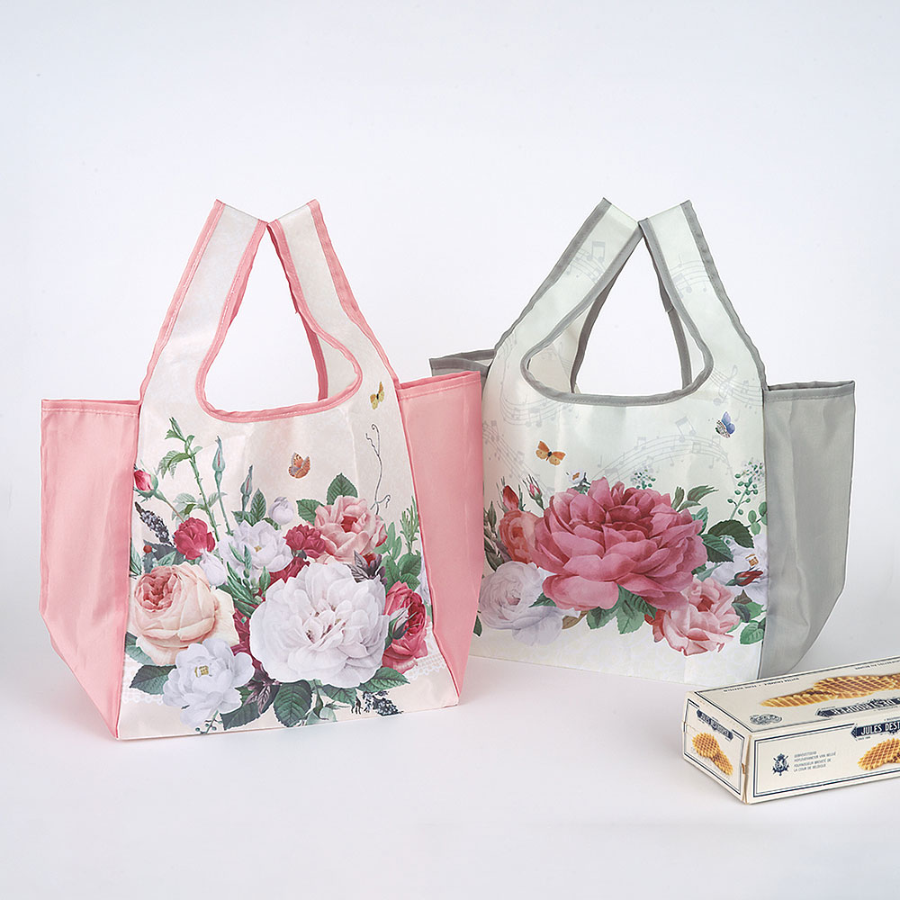 ●完成品●人気のバラ柄の、コンパクトサイズのエコバッグです。底マチが広いので、お弁当の持ち運びにも便利。同柄のポケットに収納するとスマートフォンと同じ小さなサイズになります。2点セットなのでお友達と分けても。