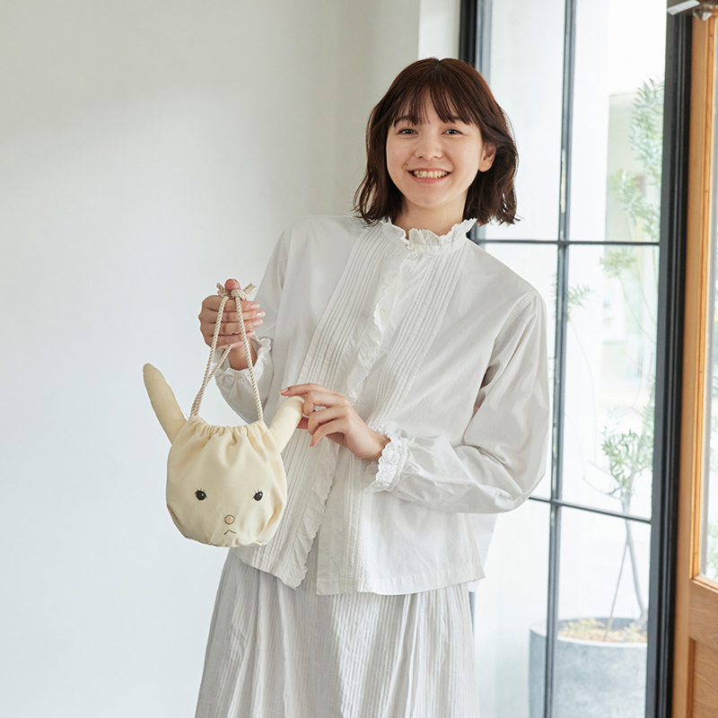 図案は消えるプリントで印刷済み。直線部分は、布に直接線を引いて裁断します。うさぎの巾着バッグの耳と底は、実物大型紙つき。