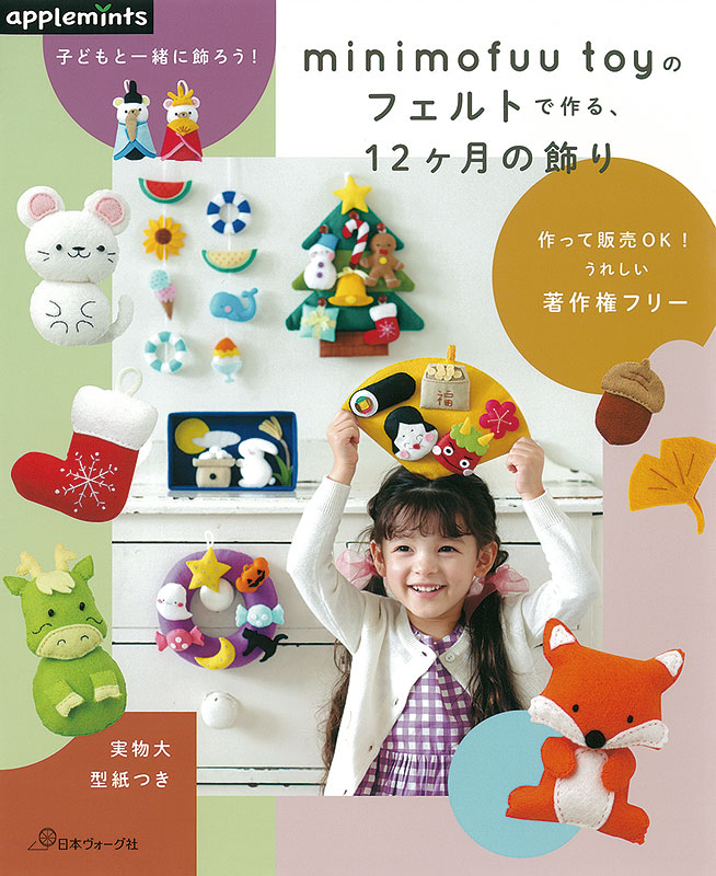 フェルト型紙作家として人気のminimofuu toyさんのワンマンブック。12ヶ月をテーマに、お部屋を飾るフェルトの作品集。作品は販売OKの著作権フリー。作品に出てくる平面のマスコットは、ブローチやチャームに展開も可能。フェルトは主にミニーフェルトを使用。色見本を見開きで紹介。