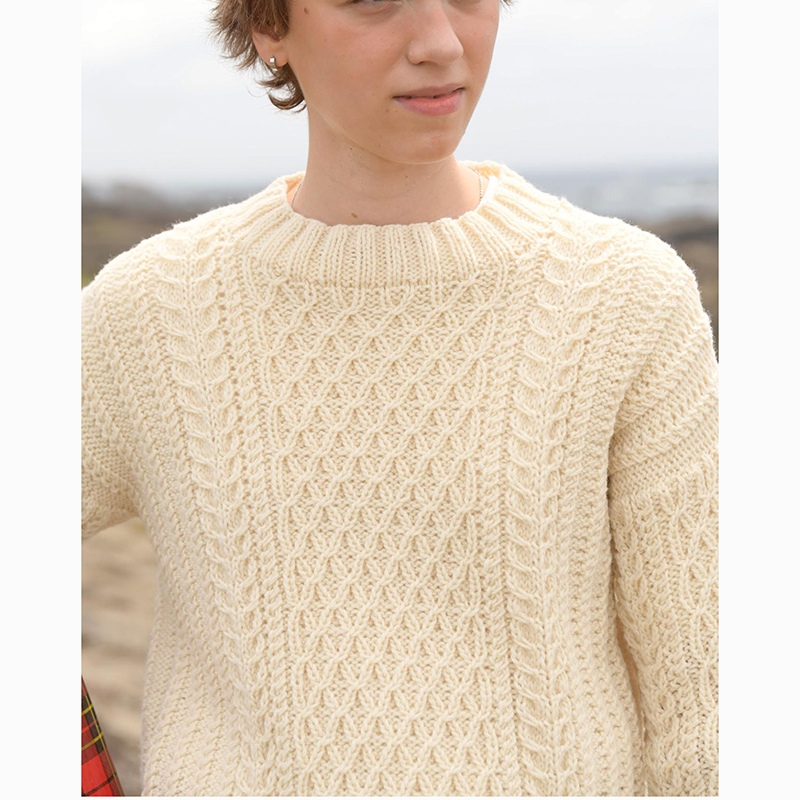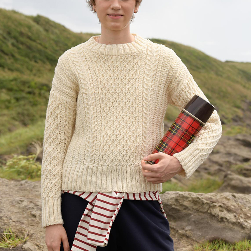 交差する表目とベースを作る裏目との陰影が美しい格子模様に、カモメを模したような1目と3目の交差を組み合わせた生成りのプルオーバー。繊細な模様同士のハーモニーでアラン模様の違った一面を魅せてくれます。