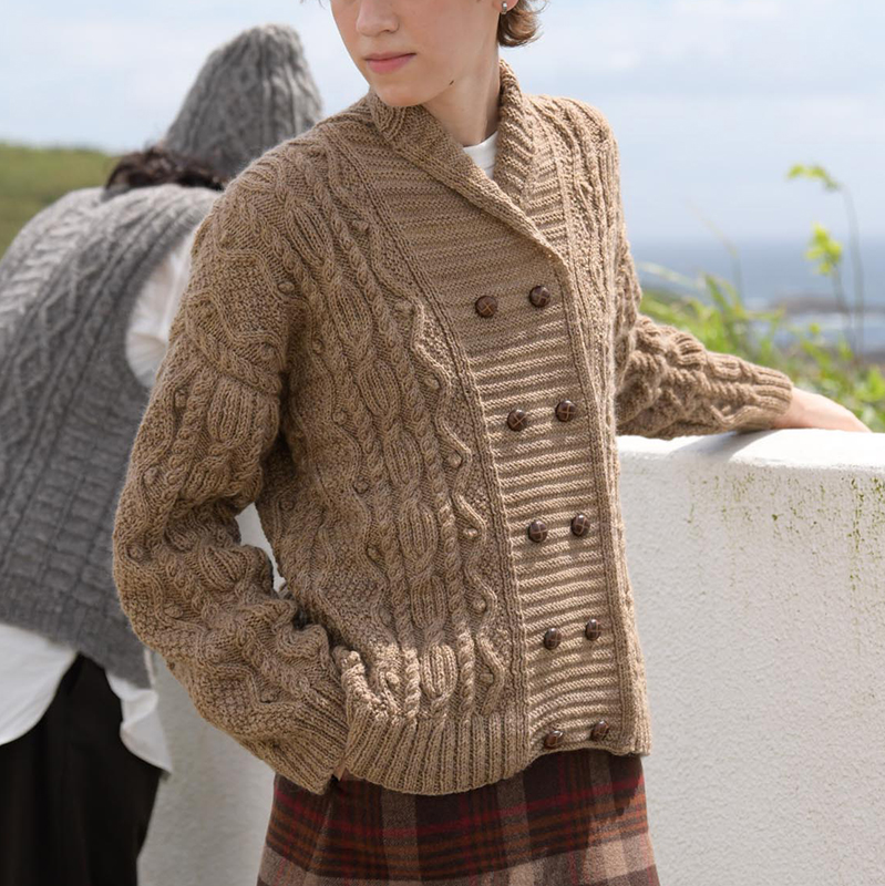 3つ組みのケーブルが印象的なダブルボタンのジャケットは、袖つけも肩はぎもまっすぐ。前立ても一緒に編んでしまうので、始末が得意ではない方にもおすすめです。袖下のとじ部分は裏メリヤス編みですっきりと仕上げています。