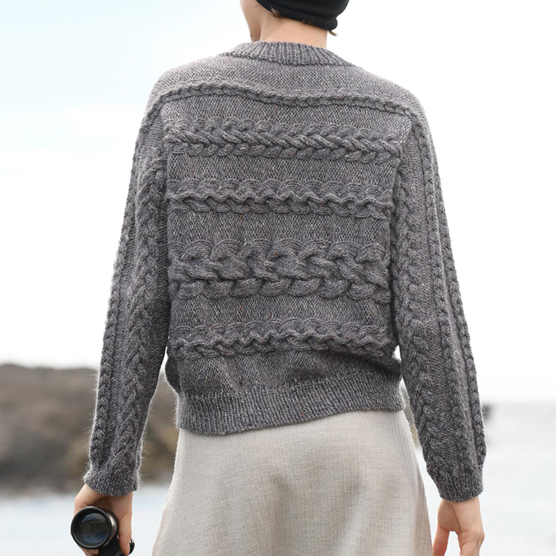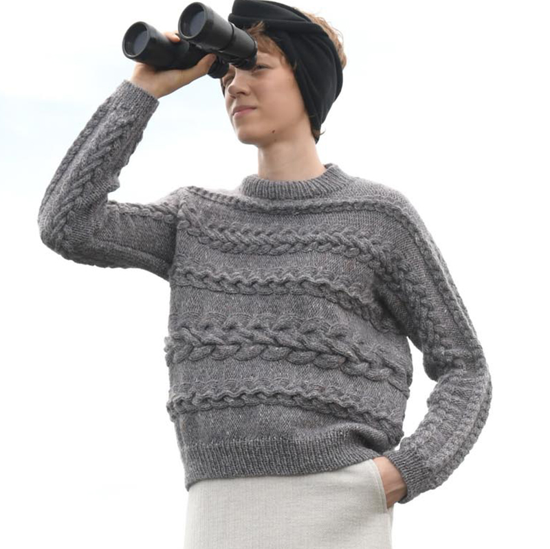 漁師にとっての命綱、農夫が収穫物を束ねる大切な縄、日々の生活に欠かせないアラン模様の代表モチーフ、ケーブルを横編みに。身頃から袖へとつながるダイナミックな大小のケーブルが新鮮な表情を見せてくれます。