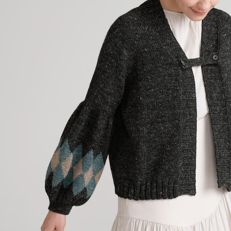 袖だけにアーガイル模様を入れた、ショート丈のカーディガン。ボリュームスリーブは重さが出ないように糸の使い方で工夫しています。白い絣のようなニュアンスのある糸なので、シックな色も重くなりすぎずに着られます。