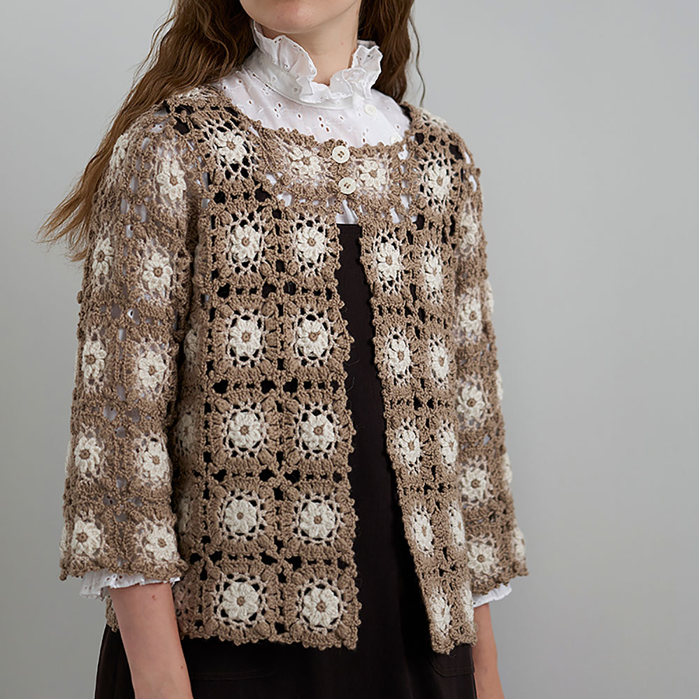 柔らかなナチュラルトーンの四角モチーフのボレロは、中央の立体的な小花をポイントに。1枚1枚、モチーフを編みながらつなげたらできあがり。変形モチーフなし、縁編みなしと、編み手に優しいデザインになっています。