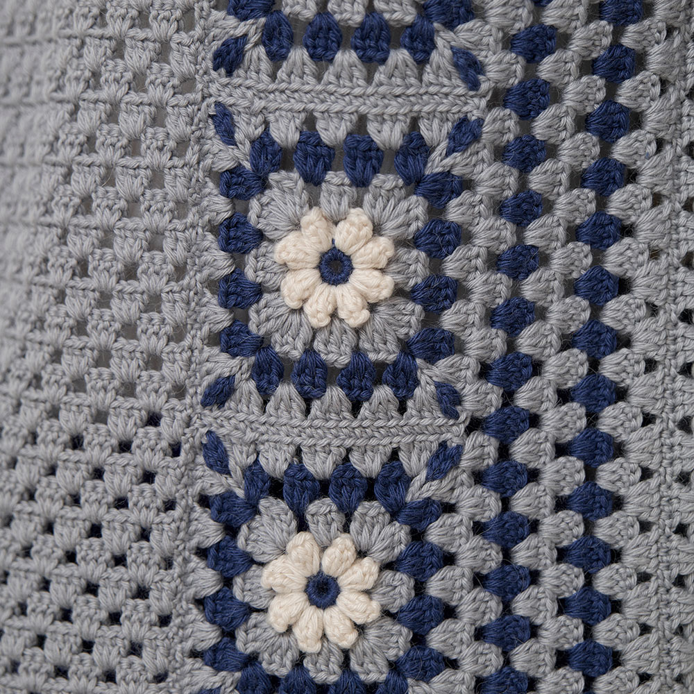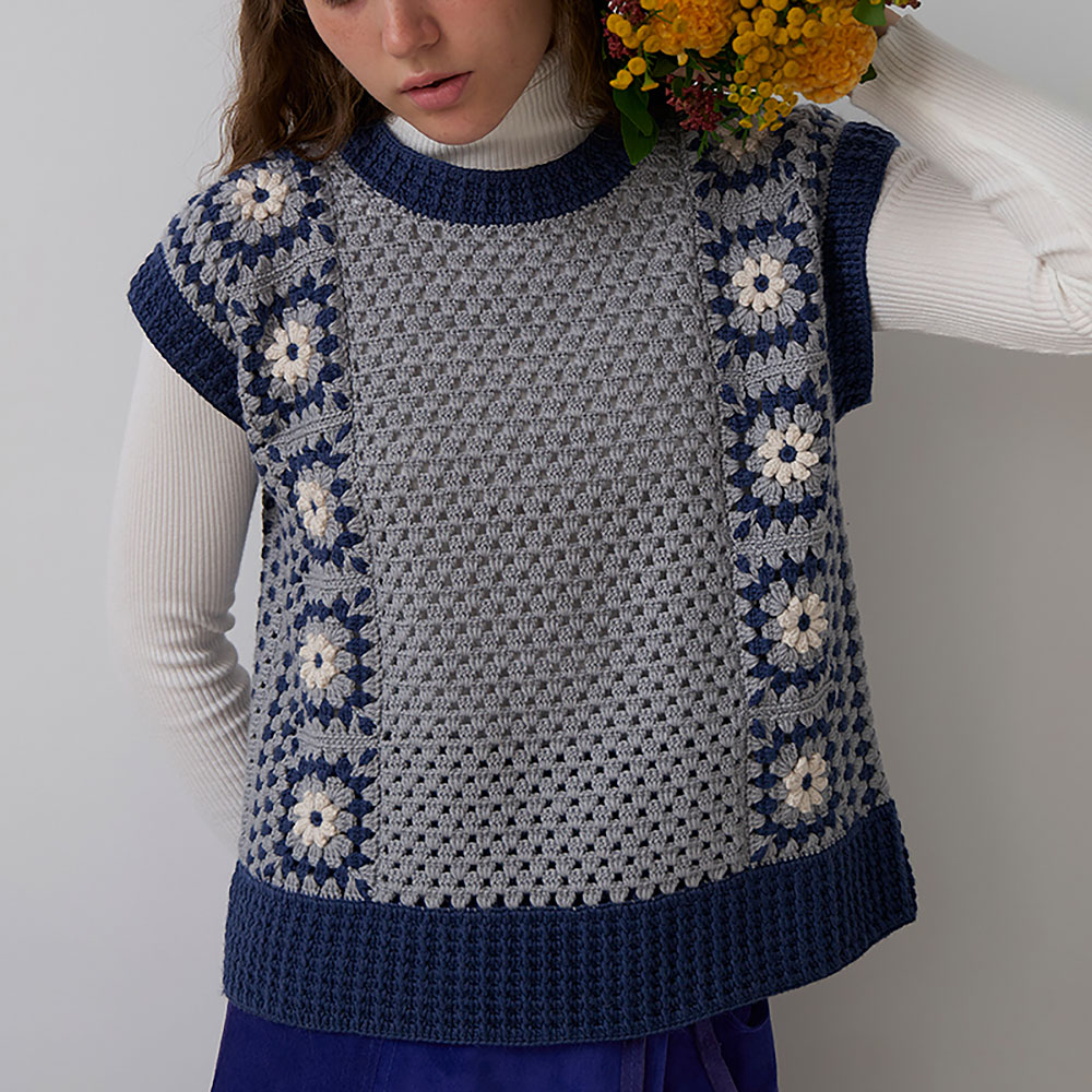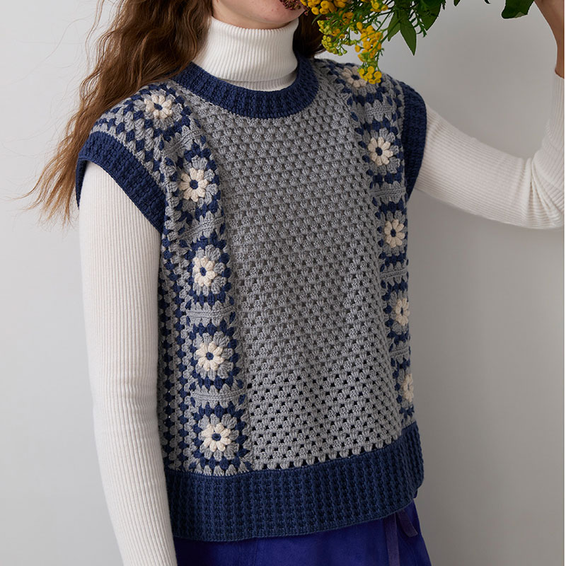 長編みをベースにした編み地に、グラニーモチーフのアレンジ形、白い小花をアクセントにしたモチーフをブレードのようにあしらいました。印象的なベストは、可愛らしさと着やすさのバランスが、絶妙なさじ加減です。