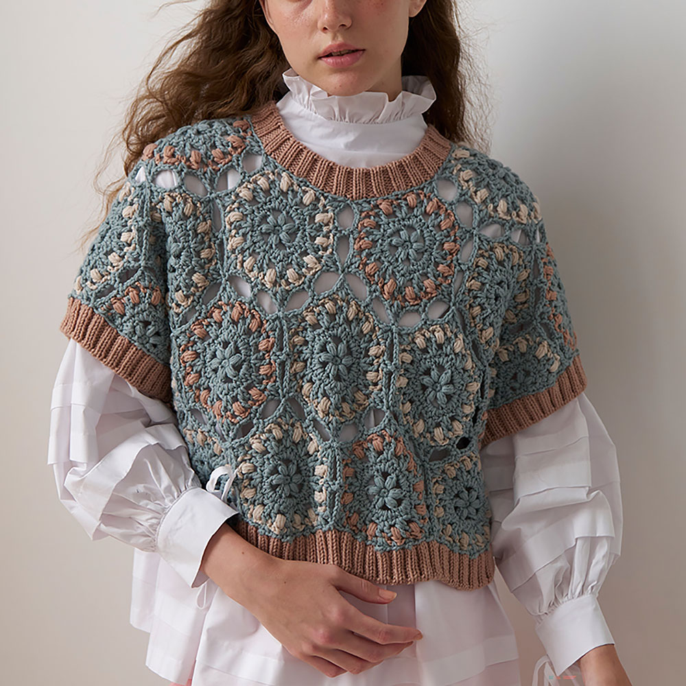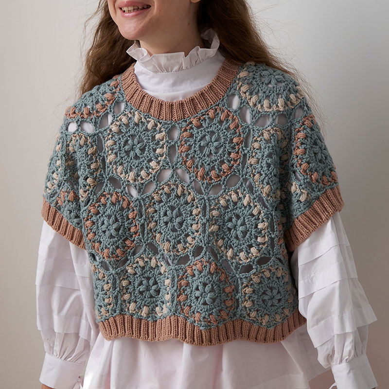 変わり玉編みの1段だけ色を変えたモチーフと、つないだときの透け感が可愛らしいベストです。裾、衿、袖口は棒針編みの2目ゴムですっきりと。効果的なハイブリット仕様が、モチーフつなぎの甘さを引き締めてくれます。