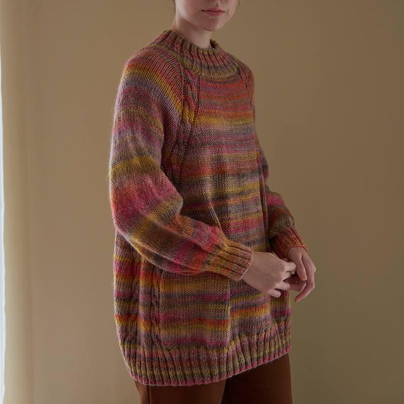 編むだけで色の変化が楽しめる段染め毛糸は、トップダウンのニットと相性抜群。美しいグラデーションが身頃や袖で分断されることなく、展開していきます。増し目の隣に編むケーブル模様が、編みやすくて嬉しいデザインポイント。